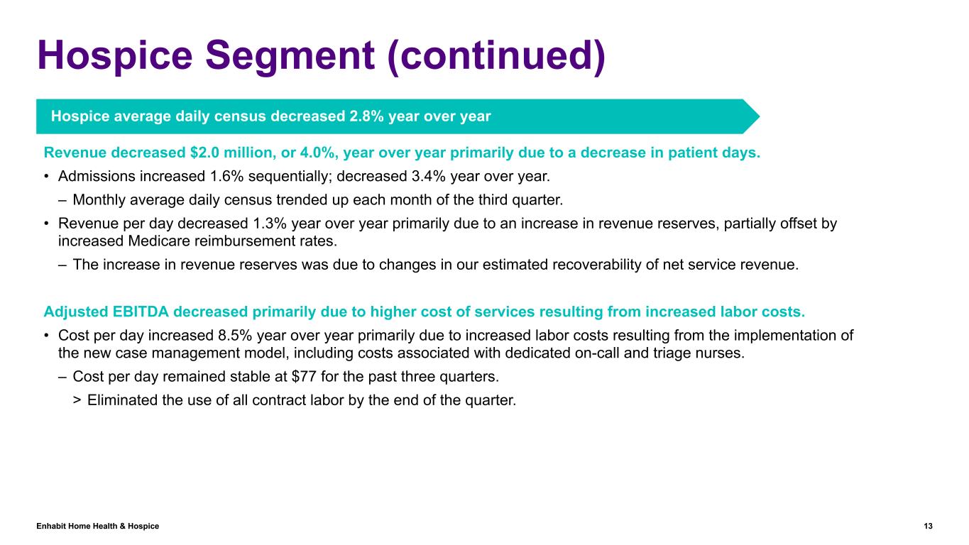 Enhabit Home Health & Hospice 12 Hospice Segment ($ in millions) Q3 '23 vs. '222023 2022 Net service revenue $47.4 $49.4 (4.0) % Cost of services 24.0 22.7 5.7 % Gross margin 49.4 % 54.0 % General & administrative expenses 15.7 17.3 (9.2) % Equity earnings / noncontrolling interest — 0.1 Adjusted EBITDA $7.7 $9.3 (17.2) % % Adj. EBITDA margin 16.2 % 18.8 % Operational metrics (Actual Amounts) Total admissions 2,882 2,982 (3.4) % Patient days 311,719 320,732 (2.8) % Discharged average length of stay 107 103 3.9 % Average daily census 3,388 3,486 (2.8) % Revenue per day $152 $154 (1.3) % Cost per day $77 $71 8.5 % Reconciliations to GAAP provided in Appendix