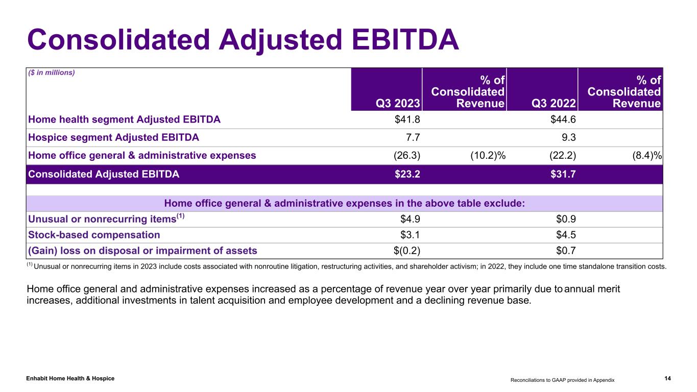 Enhabit Home Health & Hospice 13 Hospice Segment (continued) Hospice average daily census decreased 2.8% year over year Revenue decreased $2.0 million, or 4.0%, year over year primarily due to a decrease in patient days. • Admissions increased 1.6% sequentially; decreased 3.4% year over year. – Monthly average daily census trended up each month of the third quarter. • Revenue per day decreased 1.3% year over year primarily due to an increase in revenue reserves, partially offset by increased Medicare reimbursement rates. – The increase in revenue reserves was due to changes in our estimated recoverability of net service revenue. Adjusted EBITDA decreased primarily due to higher cost of services resulting from increased labor costs. • Cost per day increased 8.5% year over year primarily due to increased labor costs resulting from the implementation of the new case management model, including costs associated with dedicated on-call and triage nurses. – Cost per day remained stable at $77 for the past three quarters. > Eliminated the use of all contract labor by the end of the quarter.