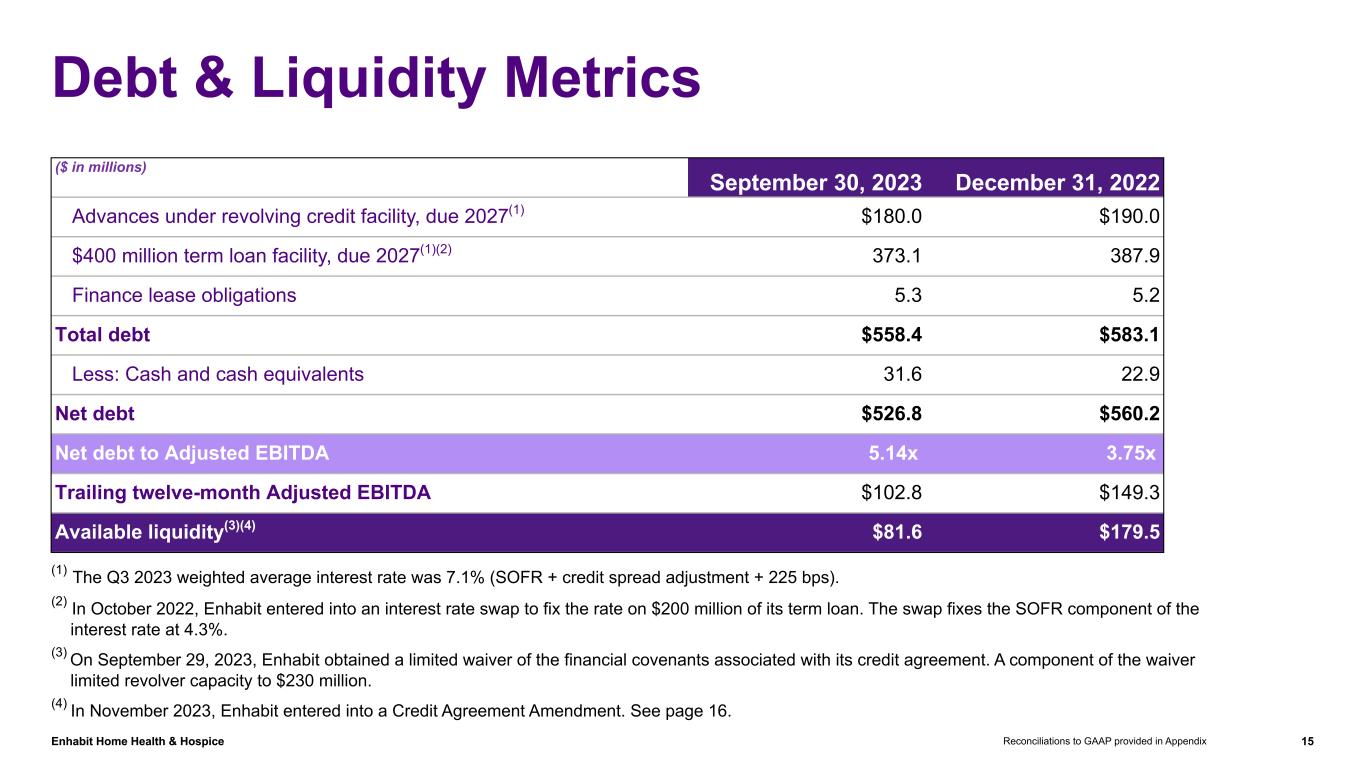 Enhabit Home Health & Hospice 14 Consolidated Adjusted EBITDA ($ in millions) Q3 2023 % of Consolidated Revenue Q3 2022 % of Consolidated Revenue Home health segment Adjusted EBITDA $41.8 $44.6 Hospice segment Adjusted EBITDA 7.7 9.3 Home office general & administrative expenses (26.3) (10.2) % (22.2) (8.4) % Consolidated Adjusted EBITDA $23.2 $31.7 Home office general & administrative expenses in the above table exclude: Unusual or nonrecurring items(1) $4.9 $0.9 Stock-based compensation $3.1 $4.5 (Gain) loss on disposal or impairment of assets $(0.2) $0.7 Home office general and administrative expenses increased as a percentage of revenue year over year primarily due to annual merit increases, additional investments in talent acquisition and employee development and a declining revenue base. Reconciliations to GAAP provided in Appendix (1) Unusual or nonrecurring items in 2023 include costs associated with nonroutine litigation, restructuring activities, and shareholder activism; in 2022, they include one time standalone transition costs.