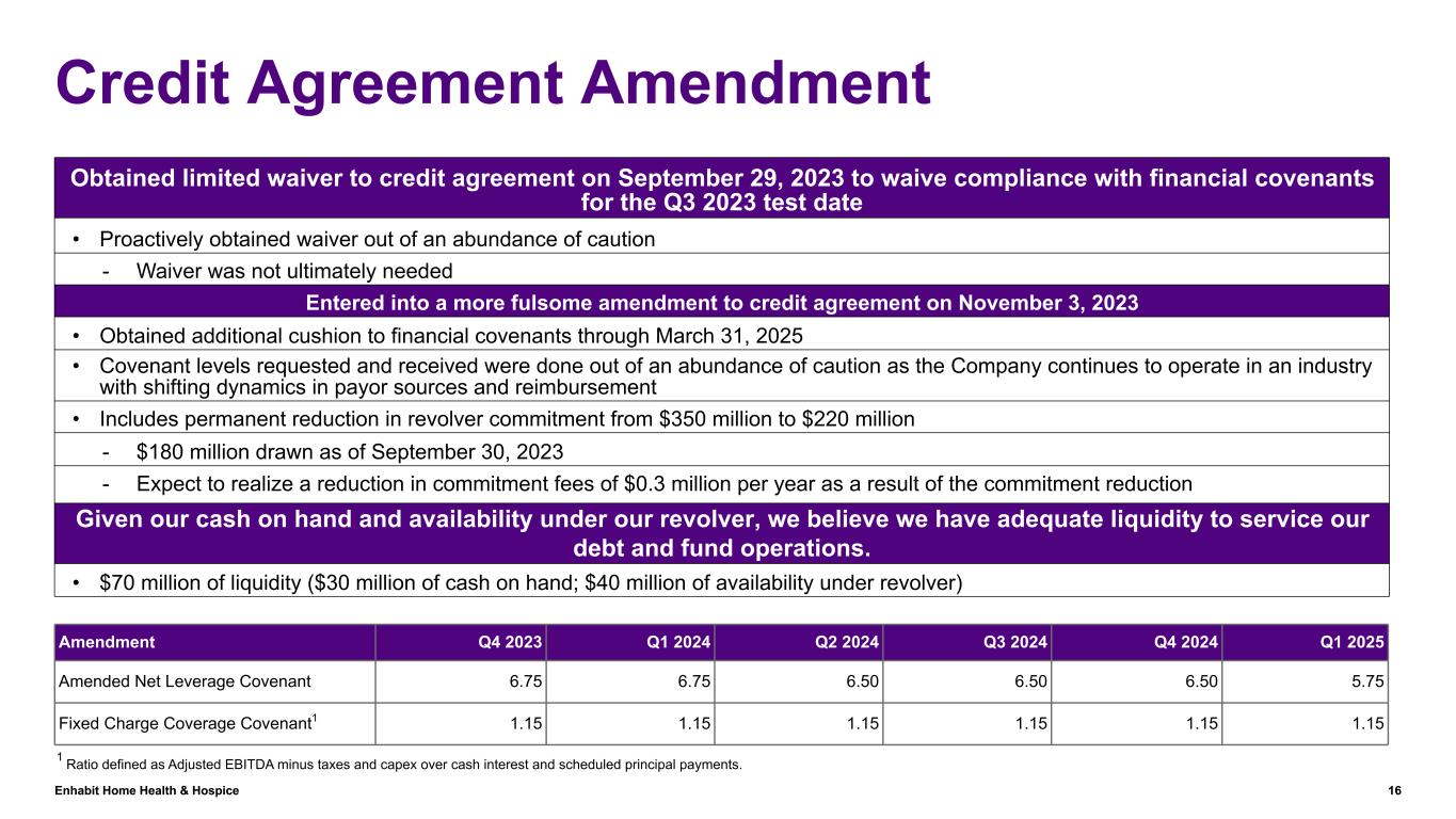 Enhabit Home Health & Hospice 15 Debt & Liquidity Metrics ($ in millions) September 30, 2023 December 31, 2022 Advances under revolving credit facility, due 2027(1) $180.0 $190.0 $400 million term loan facility, due 2027(1)(2) 373.1 387.9 Finance lease obligations 5.3 5.2 Total debt $558.4 $583.1 Less: Cash and cash equivalents 31.6 22.9 Net debt $526.8 $560.2 Net debt to Adjusted EBITDA 5.14x 3.75x Trailing twelve-month Adjusted EBITDA $102.8 $149.3 Available liquidity(3)(4) $81.6 $179.5 Reconciliations to GAAP provided in Appendix (1) The Q3 2023 weighted average interest rate was 7.1% (SOFR + credit spread adjustment + 225 bps). (2) In October 2022, Enhabit entered into an interest rate swap to fix the rate on $200 million of its term loan. The swap fixes the SOFR component of the interest rate at 4.3%. (3) On September 29, 2023, Enhabit obtained a limited waiver of the financial covenants associated with its credit agreement. A component of the waiver limited revolver capacity to $230 million. (4) In November 2023, Enhabit entered into a Credit Agreement Amendment. See page 16.