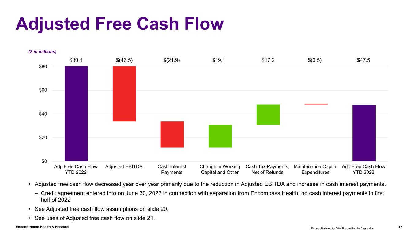 Enhabit Home Health & Hospice 16 Credit Agreement Amendment Amendment Q4 2023 Q1 2024 Q2 2024 Q3 2024 Q4 2024 Q1 2025 Amended Net Leverage Covenant 6.75 6.75 6.50 6.50 6.50 5.75 Fixed Charge Coverage Covenant1 1.15 1.15 1.15 1.15 1.15 1.15 1 Ratio defined as Adjusted EBITDA minus taxes and capex over cash interest and scheduled principal payments. Obtained limited waiver to credit agreement on September 29, 2023 to waive compliance with financial covenants for the Q3 2023 test date • Proactively obtained waiver out of an abundance of caution - Waiver was not ultimately needed Entered into a more fulsome amendment to credit agreement on November 3, 2023 • Obtained additional cushion to financial covenants through March 31, 2025 • Covenant levels requested and received were done out of an abundance of caution as the Company continues to operate in an industry with shifting dynamics in payor sources and reimbursement • Includes permanent reduction in revolver commitment from $350 million to $220 million - $180 million drawn as of September 30, 2023 - Expect to realize a reduction in commitment fees of $0.3 million per year as a result of the commitment reduction Given our cash on hand and availability under our revolver, we believe we have adequate liquidity to service our debt and fund operations. • $70 million of liquidity ($30 million of cash on hand; $40 million of availability under revolver)