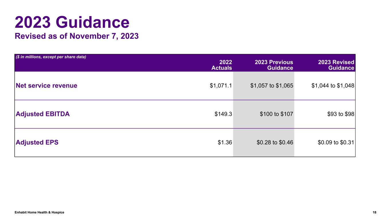 Enhabit Home Health & Hospice 17 Adjusted Free Cash Flow • Adjusted free cash flow decreased year over year primarily due to the reduction in Adjusted EBITDA and increase in cash interest payments. – Credit agreement entered into on June 30, 2022 in connection with separation from Encompass Health; no cash interest payments in first half of 2022 • See Adjusted free cash flow assumptions on slide 20. • See uses of Adjusted free cash flow on slide 21. ($ in millions) $80.1 $(46.5) $19.1$(21.9) $17.2 $(0.5) $47.5 Adj. Free Cash Flow YTD 2022 Adjusted EBITDA Cash Interest Payments Change in Working Capital and Other Cash Tax Payments, Net of Refunds Maintenance Capital Expenditures Adj. Free Cash Flow YTD 2023 $0 $20 $40 $60 $80 Reconciliations to GAAP provided in Appendix