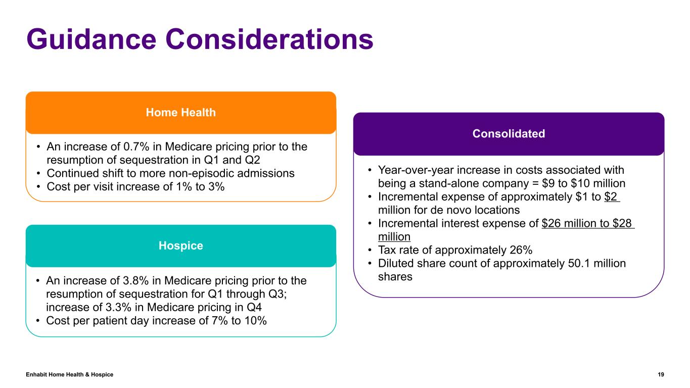 Enhabit Home Health & Hospice 19 Guidance Considerations • An increase of 0.7% in Medicare pricing prior to the resumption of sequestration in Q1 and Q2 • Continued shift to more non-episodic admissions • Cost per visit increase of 1% to 3% Home Health • An increase of 3.8% in Medicare pricing prior to the resumption of sequestration for Q1 through Q3; increase of 3.3% in Medicare pricing in Q4 • Cost per patient day increase of 7% to 10% Hospice • Year-over-year increase in costs associated with being a stand-alone company = $9 to $10 million • Incremental expense of approximately $1 to $2 million for de novo locations • Incremental interest expense of $26 million to $28 million • Tax rate of approximately 26% • Diluted share count of approximately 50.1 million shares Consolidated
