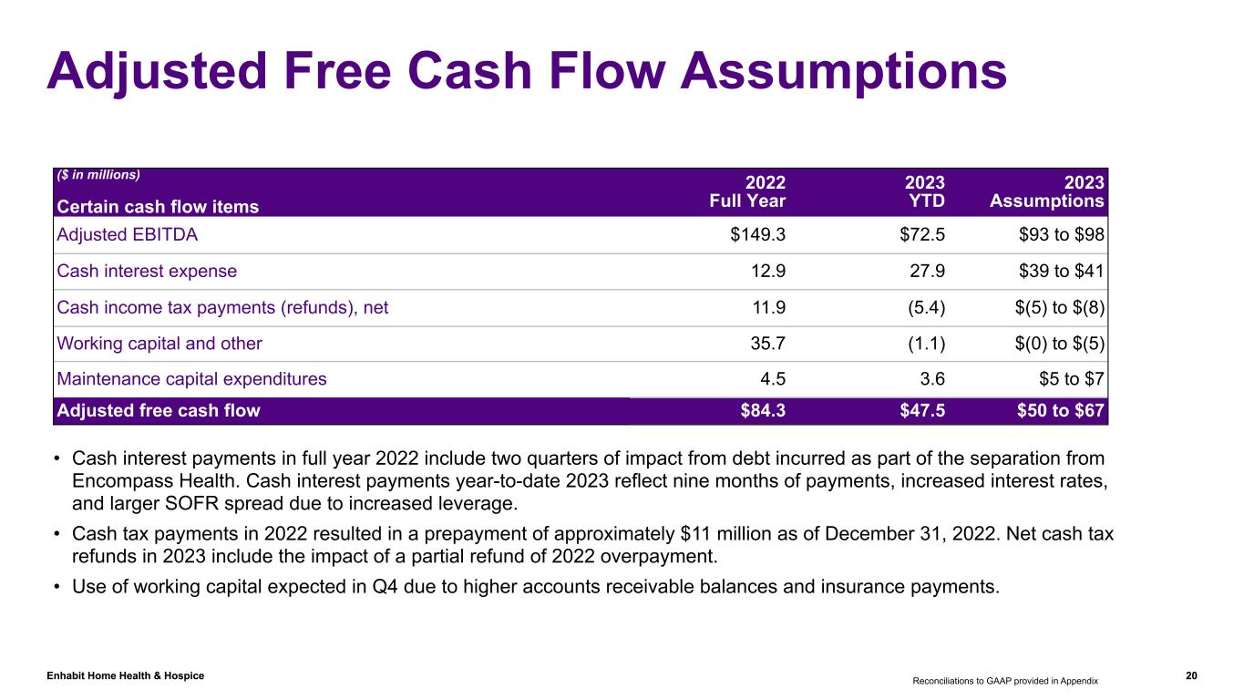 Enhabit Home Health & Hospice 38 Reconciliation of Net Cash Provided by Operating Activities to Adjusted Free Cash Flow ($ in millions) Third Quarter YTD 2023 2022 2023 2022 Net cash provided by operating activities $6.3 $1.0 $45.5 $76.0 Unusual or nonrecurring items that are not typical of ongoing operations(1) 4.9 0.9 9.8 7.0 Cash expenditures for maintenance (1.9) (0.5) (3.6) (3.1) Other working capital adjustments (0.7) 0.9 (1.7) — Distributions paid to noncontrolling interests of consolidated affiliates — (0.2) (2.5) (0.9) Stock-based compensation included in overhead allocation — — — 1.1 Adjusted free cash flow $8.6 $2.1 $47.5 $80.1 (1) Unusual or nonrecurring items in 2023 include costs associated with nonroutine litigation, restructuring activities, and shareholder activism; in Q3 2022, they include one time standalone transition costs; in YTD 2022, they include one time standalone transition costs and costs due to Encompass strategic review.