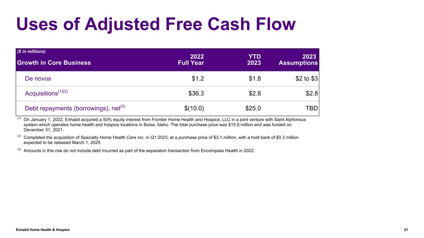 Enhabit Home Health & Hospice 20 Adjusted Free Cash Flow Assumptions ($ in millions) Certain cash flow items 2022 Full Year 2023 YTD 2023 Assumptions Adjusted EBITDA $149.3 $72.5 $93 to $98 Cash interest expense 12.9 27.9 $39 to $41 Cash income tax payments (refunds), net 11.9 (5.4) $(5) to $(8) Working capital and other 35.7 (1.1) $(0) to $(5) Maintenance capital expenditures 4.5 3.6 $5 to $7 Adjusted free cash flow $84.3 $47.5 $50 to $67 Reconciliations to GAAP provided in Appendix • Cash interest payments in full year 2022 include two quarters of impact from debt incurred as part of the separation from Encompass Health. Cash interest payments year-to-date 2023 reflect nine months of payments, increased interest rates, and larger SOFR spread due to increased leverage. • Cash tax payments in 2022 resulted in a prepayment of approximately $11 million as of December 31, 2022. Net cash tax refunds in 2023 include the impact of a partial refund of 2022 overpayment. • Use of working capital expected in Q4 due to higher accounts receivable balances and insurance payments.