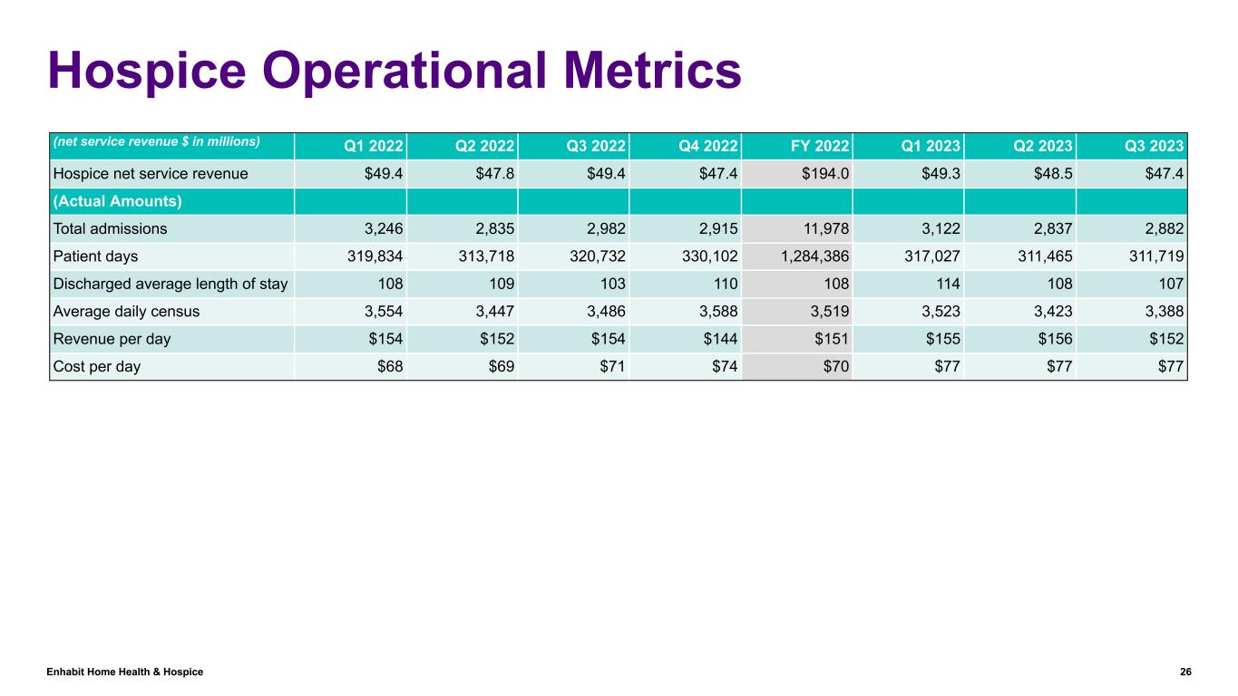 Enhabit Home Health & Hospice 25 Home Health Operational Metrics (net service revenue $ in millions) Q1 2022 Q2 2022 Q3 2022 Q4 2022 FY 2022 Q1 2023 Q2 2023 Q3 2023 Home health net service revenue $224.9 $220.2 $216.3 $215.8 $877.1 $215.8 $213.8 $210.9 (Actual Amounts) Total admissions 53,309 49,399 49,739 50,048 202,495 53,943 50,975 50,523 Episodic admissions 38,971 36,106 35,487 34,572 145,136 35,032 32,628 31,490 Non-episodic admissions 14,338 13,293 14,252 15,476 57,359 18,911 18,347 19,033 Total recertifications 31,787 32,440 32,362 32,383 128,972 31,778 33,342 32,732 Episodic recertifications 25,808 25,993 25,821 25,279 102,901 23,674 23,788 23,290 Non-episodic recertifications 5,979 6,447 6,541 7,104 26,071 8,104 9,554 9,442 Total starts of care 85,096 81,839 82,101 82,431 331,467 85,721 84,317 83,255 Completed episodes 63,111 62,691 60,396 60,250 246,448 57,827 56,808 53,484 Avg. revenue per episode $3,038 $2,972 $3,009 $2,958 $2,995 $2,943 $2,913 $3,128 Visits per episode 15.2 15.0 14.9 14.3 14.9 14.8 14.6 14.9 Total visits 1,228,084 1,217,447 1,175,002 1,159,420 4,779,953 1,205,700 1,205,865 1,162,144 Non-episodic visits 270,253 275,679 272,282 297,350 1,115,564 351,283 377,214 365,071 Cost per visit $86 $88 $92 $92 $89 $88 $91 $93