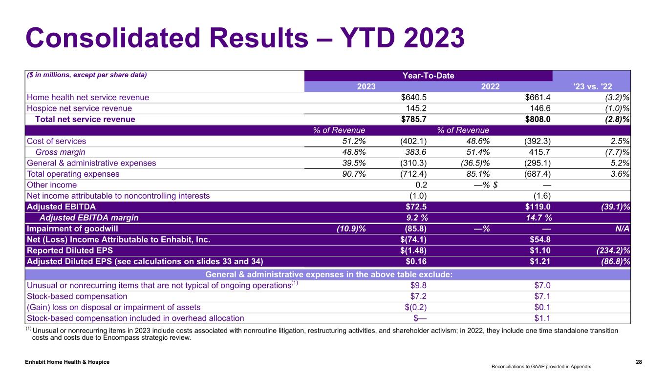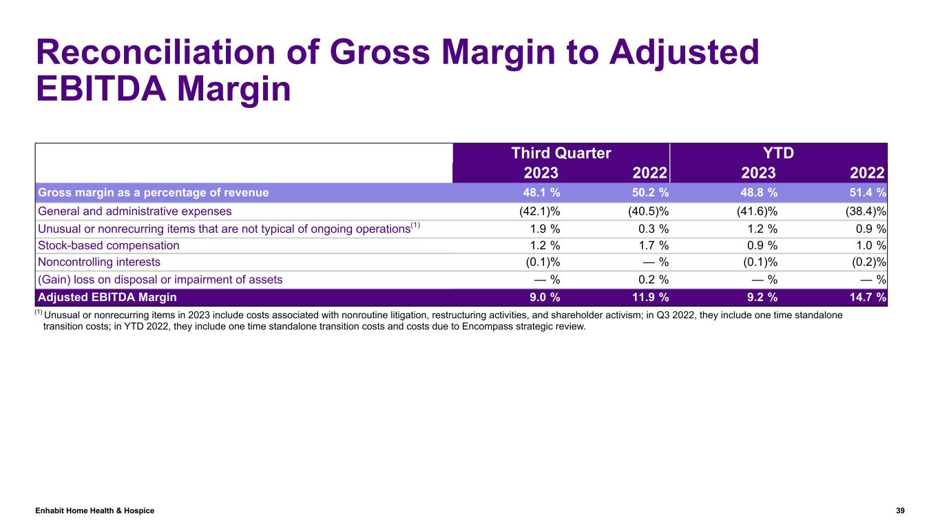 Enhabit Home Health & Hospice 39 Reconciliation of Gross Margin to Adjusted EBITDA Margin Third Quarter YTD 2023 2022 2023 2022 Gross margin as a percentage of revenue 48.1 % 50.2 % 48.8 % 51.4 % General and administrative expenses (42.1) % (40.5) % (41.6) % (38.4) % Unusual or nonrecurring items that are not typical of ongoing operations(1) 1.9 % 0.3 % 1.2 % 0.9 % Stock-based compensation 1.2 % 1.7 % 0.9 % 1.0 % Noncontrolling interests (0.1) % — % (0.1) % (0.2) % (Gain) loss on disposal or impairment of assets — % 0.2 % — % — % Adjusted EBITDA Margin 9.0 % 11.9 % 9.2 % 14.7 % (1) Unusual or nonrecurring items in 2023 include costs associated with nonroutine litigation, restructuring activities, and shareholder activism; in Q3 2022, they include one time standalone transition costs; in YTD 2022, they include one time standalone transition costs and costs due to Encompass strategic review.