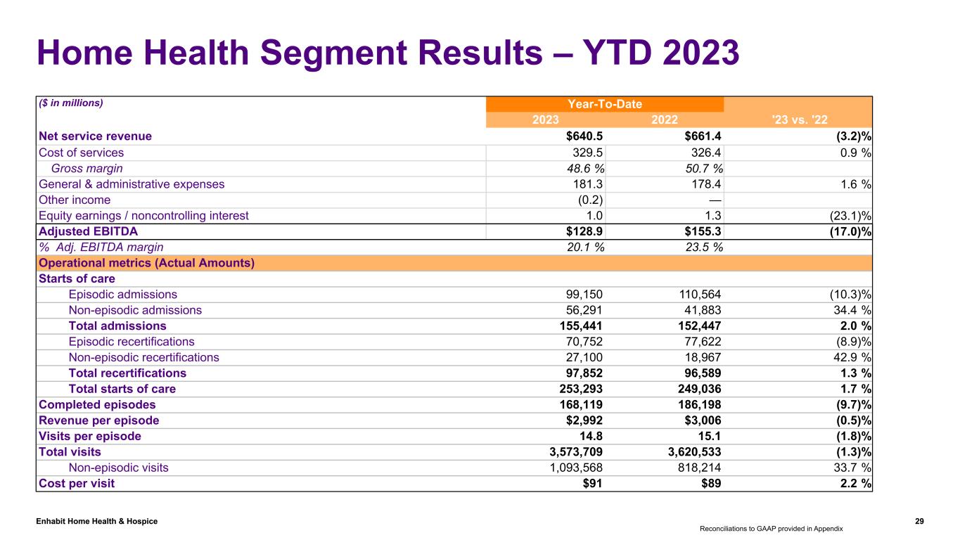 Enhabit Home Health & Hospice 28 Consolidated Results – YTD 2023 ($ in millions, except per share data) Year-To-Date '23 vs. '222023 2022 Home health net service revenue $640.5 $661.4 (3.2) % Hospice net service revenue 145.2 146.6 (1.0) % Total net service revenue $785.7 $808.0 (2.8) % % of Revenue % of Revenue Cost of services 51.2 % (402.1) 48.6 % (392.3) 2.5 % Gross margin 48.8 % 383.6 51.4 % 415.7 (7.7) % General & administrative expenses 39.5 % (310.3) (36.5) % (295.1) 5.2 % Total operating expenses 90.7 % (712.4) 85.1 % (687.4) 3.6 % Other income 0.2 — % $ — Net income attributable to noncontrolling interests (1.0) (1.6) Adjusted EBITDA $72.5 $119.0 (39.1) % Adjusted EBITDA margin 9.2 % 14.7 % Impairment of goodwill (10.9) % (85.8) — % — N/A Net (Loss) Income Attributable to Enhabit, Inc. $(74.1) $54.8 Reported Diluted EPS $(1.48) $1.10 (234.2) % Adjusted Diluted EPS (see calculations on slides 33 and 34) $0.16 $1.21 (86.8) % General & administrative expenses in the above table exclude: Unusual or nonrecurring items that are not typical of ongoing operations(1) $9.8 $7.0 Stock-based compensation $7.2 $7.1 (Gain) loss on disposal or impairment of assets $(0.2) $0.1 Stock-based compensation included in overhead allocation $— $1.1 Reconciliations to GAAP provided in Appendix (1) Unusual or nonrecurring items in 2023 include costs associated with nonroutine litigation, restructuring activities, and shareholder activism; in 2022, they include one time standalone transition costs and costs due to Encompass strategic review.