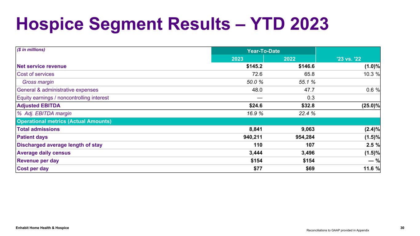 Enhabit Home Health & Hospice 29 Home Health Segment Results – YTD 2023 ($ in millions) Year-To-Date '23 vs. '222023 2022 Net service revenue $640.5 $661.4 (3.2) % Cost of services 329.5 326.4 0.9 % Gross margin 48.6 % 50.7 % General & administrative expenses 181.3 178.4 1.6 % Other income (0.2) — Equity earnings / noncontrolling interest 1.0 1.3 (23.1) % Adjusted EBITDA $128.9 $155.3 (17.0) % % Adj. EBITDA margin 20.1 % 23.5 % Operational metrics (Actual Amounts) Starts of care Episodic admissions 99,150 110,564 (10.3) % Non-episodic admissions 56,291 41,883 34.4 % Total admissions 155,441 152,447 2.0 % Episodic recertifications 70,752 77,622 (8.9) % Non-episodic recertifications 27,100 18,967 42.9 % Total recertifications 97,852 96,589 1.3 % Total starts of care 253,293 249,036 1.7 % Completed episodes 168,119 186,198 (9.7) % Revenue per episode $2,992 $3,006 (0.5) % Visits per episode 14.8 15.1 (1.8) % Total visits 3,573,709 3,620,533 (1.3) % Non-episodic visits 1,093,568 818,214 33.7 % Cost per visit $91 $89 2.2 % Reconciliations to GAAP provided in Appendix
