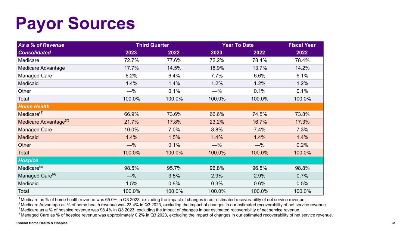 Enhabit Home Health & Hospice 30 Hospice Segment Results – YTD 2023 ($ in millions) Year-To-Date '23 vs. '222023 2022 Net service revenue $145.2 $146.6 (1.0) % Cost of services 72.6 65.8 10.3 % Gross margin 50.0 % 55.1 % General & administrative expenses 48.0 47.7 0.6 % Equity earnings / noncontrolling interest — 0.3 Adjusted EBITDA $24.6 $32.8 (25.0) % % Adj. EBITDA margin 16.9 % 22.4 % Operational metrics (Actual Amounts) Total admissions 8,841 9,063 (2.4) % Patient days 940,211 954,284 (1.5) % Discharged average length of stay 110 107 2.5 % Average daily census 3,444 3,496 (1.5) % Revenue per day $154 $154 — % Cost per day $77 $69 11.6 % Reconciliations to GAAP provided in Appendix