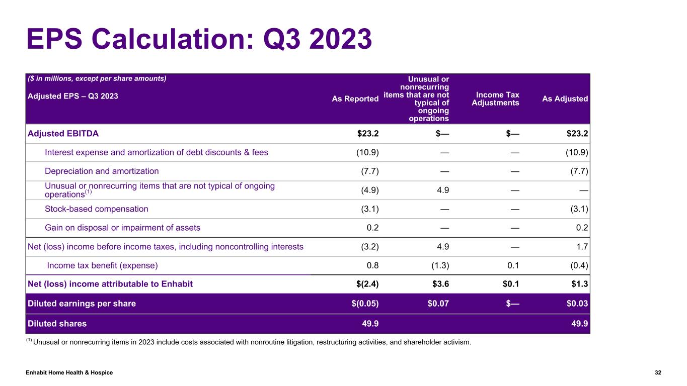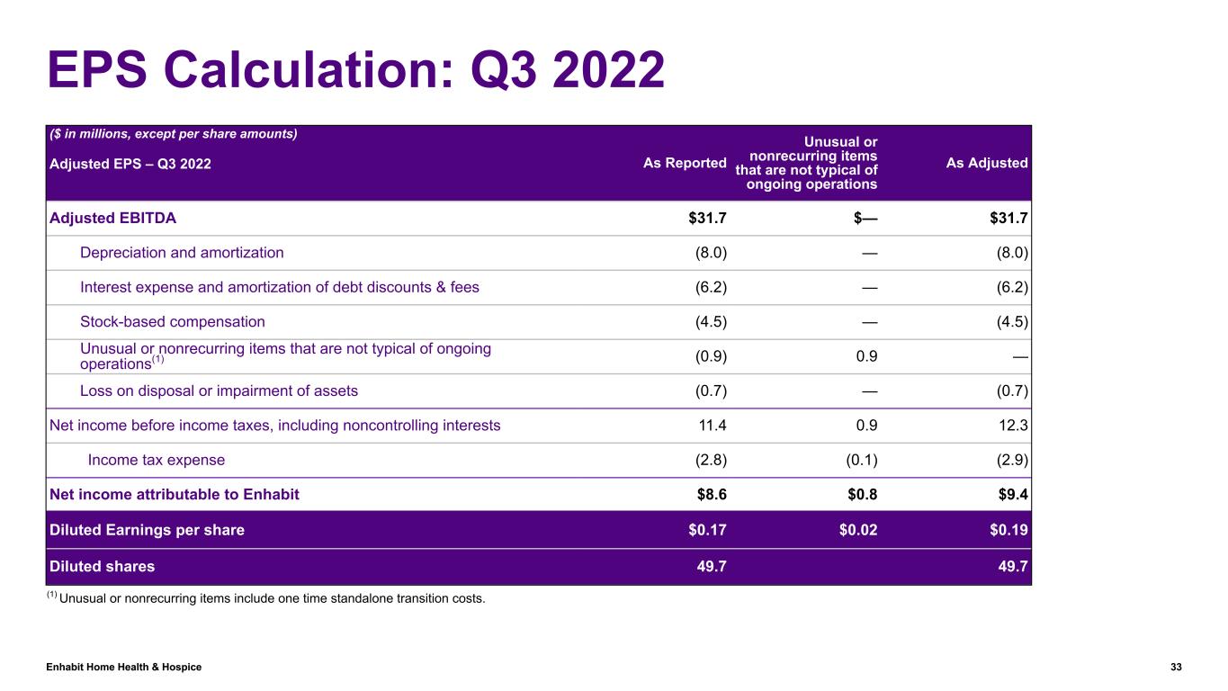 Enhabit Home Health & Hospice 32 EPS Calculation: Q3 2023 ($ in millions, except per share amounts) Adjusted EPS – Q3 2023 As Reported Unusual or nonrecurring items that are not typical of ongoing operations Income Tax Adjustments As Adjusted Adjusted EBITDA $23.2 $— $— $23.2 Interest expense and amortization of debt discounts & fees (10.9) — — (10.9) Depreciation and amortization (7.7) — — (7.7) Unusual or nonrecurring items that are not typical of ongoing operations(1) (4.9) 4.9 — — Stock-based compensation (3.1) — — (3.1) Gain on disposal or impairment of assets 0.2 — — 0.2 Net (loss) income before income taxes, including noncontrolling interests (3.2) 4.9 — 1.7 Income tax benefit (expense) 0.8 (1.3) 0.1 (0.4) Net (loss) income attributable to Enhabit $(2.4) $3.6 $0.1 $1.3 Diluted earnings per share $(0.05) $0.07 $— $0.03 Diluted shares 49.9 49.9 (1) Unusual or nonrecurring items in 2023 include costs associated with nonroutine litigation, restructuring activities, and shareholder activism.