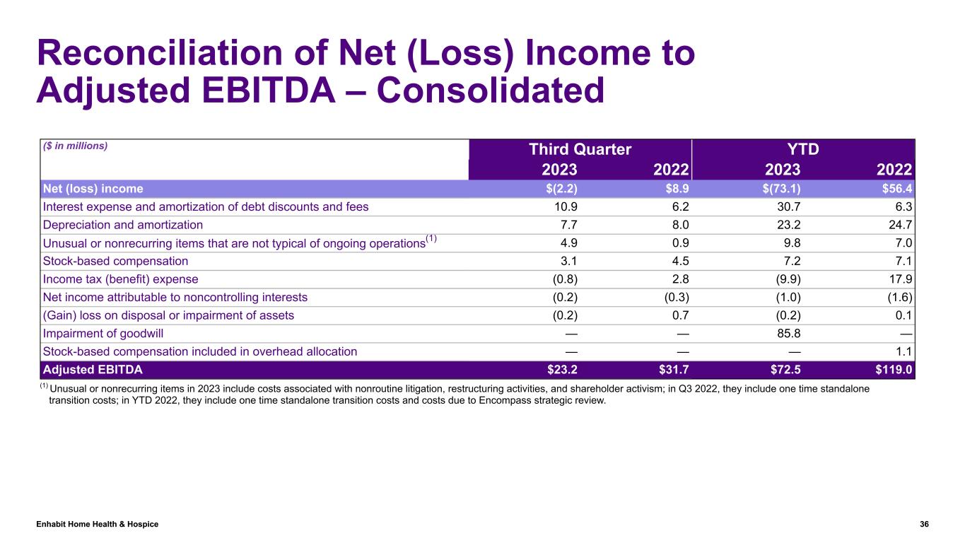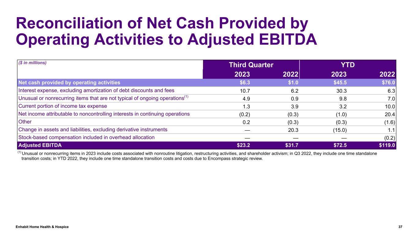 Enhabit Home Health & Hospice 36 Reconciliation of Net (Loss) Income to Adjusted EBITDA – Consolidated ($ in millions) Third Quarter YTD 2023 2022 2023 2022 Net (loss) income $(2.2) $8.9 $(73.1) $56.4 Interest expense and amortization of debt discounts and fees 10.9 6.2 30.7 6.3 Depreciation and amortization 7.7 8.0 23.2 24.7 Unusual or nonrecurring items that are not typical of ongoing operations(1) 4.9 0.9 9.8 7.0 Stock-based compensation 3.1 4.5 7.2 7.1 Income tax (benefit) expense (0.8) 2.8 (9.9) 17.9 Net income attributable to noncontrolling interests (0.2) (0.3) (1.0) (1.6) (Gain) loss on disposal or impairment of assets (0.2) 0.7 (0.2) 0.1 Impairment of goodwill — — 85.8 — Stock-based compensation included in overhead allocation — — — 1.1 Adjusted EBITDA $23.2 $31.7 $72.5 $119.0 (1) Unusual or nonrecurring items in 2023 include costs associated with nonroutine litigation, restructuring activities, and shareholder activism; in Q3 2022, they include one time standalone transition costs; in YTD 2022, they include one time standalone transition costs and costs due to Encompass strategic review.