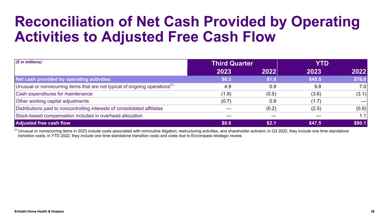 Enhabit Home Health & Hospice 37 Reconciliation of Net Cash Provided by Operating Activities to Adjusted EBITDA ($ in millions) Third Quarter YTD 2023 2022 2023 2022 Net cash provided by operating activities $6.3 $1.0 $45.5 $76.0 Interest expense, excluding amortization of debt discounts and fees 10.7 6.2 30.3 6.3 Unusual or nonrecurring items that are not typical of ongoing operations(1) 4.9 0.9 9.8 7.0 Current portion of income tax expense 1.3 3.9 3.2 10.0 Net income attributable to noncontrolling interests in continuing operations (0.2) (0.3) (1.0) 20.4 Other 0.2 (0.3) (0.3) (1.6) Change in assets and liabilities, excluding derivative instruments — 20.3 (15.0) 1.1 Stock-based compensation included in overhead allocation — — — (0.2) Adjusted EBITDA $23.2 $31.7 $72.5 $119.0 (1) Unusual or nonrecurring items in 2023 include costs associated with nonroutine litigation, restructuring activities, and shareholder activism; in Q3 2022, they include one time standalone transition costs; in YTD 2022, they include one time standalone transition costs and costs due to Encompass strategic review.