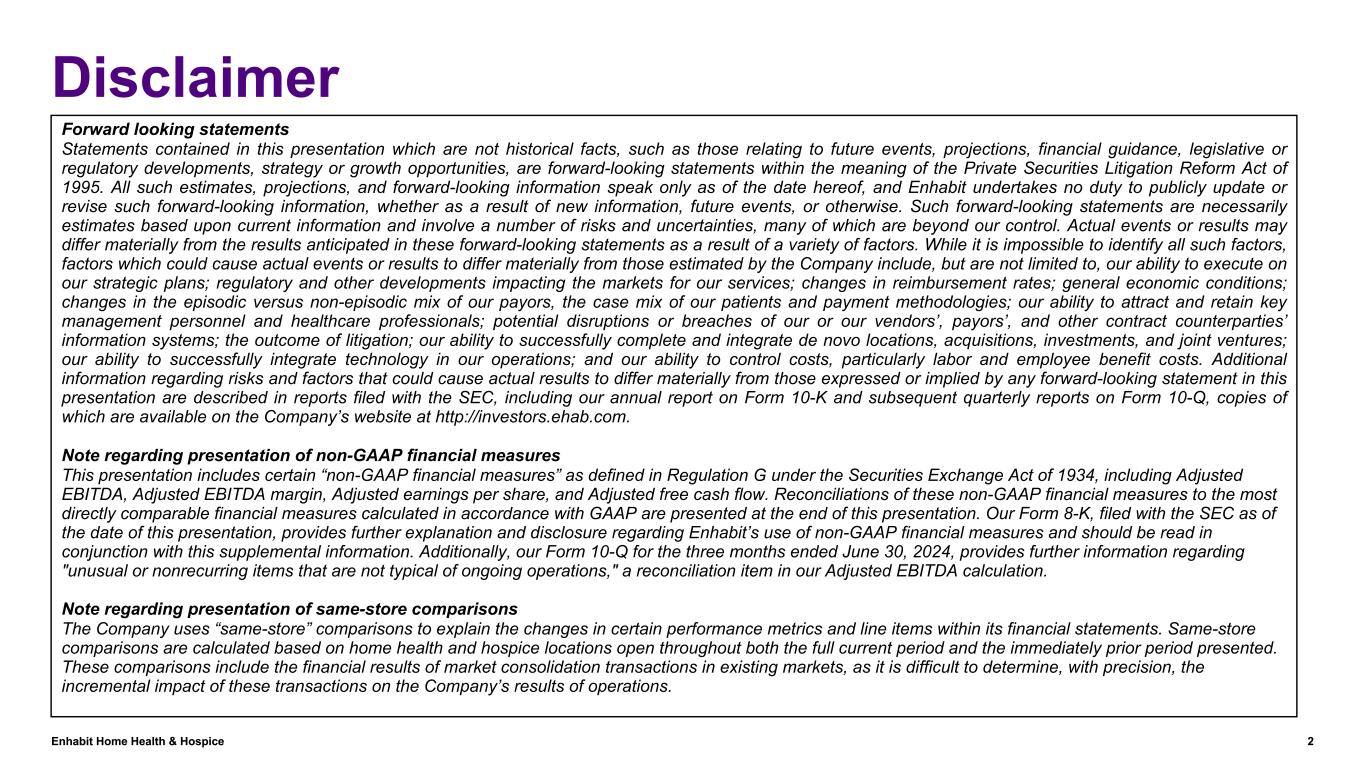 Enhabit Home Health & Hospice 2 Disclaimer Forward looking statements Statements contained in this presentation which are not historical facts, such as those relating to future events, projections, financial guidance, legislative or regulatory developments, strategy or growth opportunities, are forward-looking statements within the meaning of the Private Securities Litigation Reform Act of 1995. All such estimates, projections, and forward-looking information speak only as of the date hereof, and Enhabit undertakes no duty to publicly update or revise such forward-looking information, whether as a result of new information, future events, or otherwise. Such forward-looking statements are necessarily estimates based upon current information and involve a number of risks and uncertainties, many of which are beyond our control. Actual events or results may differ materially from the results anticipated in these forward-looking statements as a result of a variety of factors. While it is impossible to identify all such factors, factors which could cause actual events or results to differ materially from those estimated by the Company include, but are not limited to, our ability to execute on our strategic plans; regulatory and other developments impacting the markets for our services; changes in reimbursement rates; general economic conditions; changes in the episodic versus non-episodic mix of our payors, the case mix of our patients and payment methodologies; our ability to attract and retain key management personnel and healthcare professionals; potential disruptions or breaches of our or our vendors’, payors’, and other contract counterparties’ information systems; the outcome of litigation; our ability to successfully complete and integrate de novo locations, acquisitions, investments, and joint ventures; our ability to successfully integrate technology in our operations; and our ability to control costs, particularly labor and employee benefit costs. Additional information regarding risks and factors that could cause actual results to differ materially from those expressed or implied by any forward-looking statement in this presentation are described in reports filed with the SEC, including our annual report on Form 10-K and subsequent quarterly reports on Form 10-Q, copies of which are available on the Company’s website at http://investors.ehab.com. Note regarding presentation of non-GAAP financial measures This presentation includes certain “non-GAAP financial measures” as defined in Regulation G under the Securities Exchange Act of 1934, including Adjusted EBITDA, Adjusted EBITDA margin, Adjusted earnings per share, and Adjusted free cash flow. Reconciliations of these non-GAAP financial measures to the most directly comparable financial measures calculated in accordance with GAAP are presented at the end of this presentation. Our Form 8-K, filed with the SEC as of the date of this presentation, provides further explanation and disclosure regarding Enhabit’s use of non-GAAP financial measures and should be read in conjunction with this supplemental information. Additionally, our Form 10-Q for the three months ended June 30, 2024, provides further information regarding "unusual or nonrecurring items that are not typical of ongoing operations," a reconciliation item in our Adjusted EBITDA calculation. Note regarding presentation of same-store comparisons The Company uses “same-store” comparisons to explain the changes in certain performance metrics and line items within its financial statements. Same-store comparisons are calculated based on home health and hospice locations open throughout both the full current period and the immediately prior period presented. These comparisons include the financial results of market consolidation transactions in existing markets, as it is difficult to determine, with precision, the incremental impact of these transactions on the Company’s results of operations.