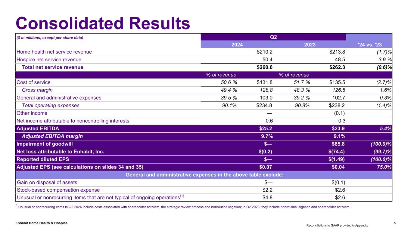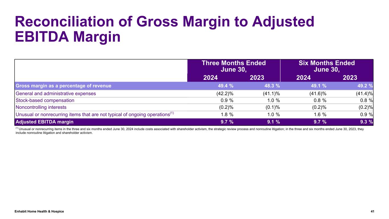 Enhabit Home Health & Hospice 41 Reconciliation of Gross Margin to Adjusted EBITDA Margin Three Months Ended June 30, Six Months Ended June 30, 2024 2023 2024 2023 Gross margin as a percentage of revenue 49.4 % 48.3 % 49.1 % 49.2 % General and administrative expenses (42.2) % (41.1) % (41.6) % (41.4) % Stock-based compensation 0.9 % 1.0 % 0.8 % 0.8 % Noncontrolling interests (0.2) % (0.1) % (0.2) % (0.2) % Unusual or nonrecurring items that are not typical of ongoing operations(1) 1.8 % 1.0 % 1.6 % 0.9 % Adjusted EBITDA margin 9.7 % 9.1 % 9.7 % 9.3 % (1) Unusual or nonrecurring items in the three and six months ended June 30, 2024 include costs associated with shareholder activism, the strategic review process and nonroutine litigation; in the three and six months ended June 30, 2023, they include nonroutine litigation and shareholder activism.