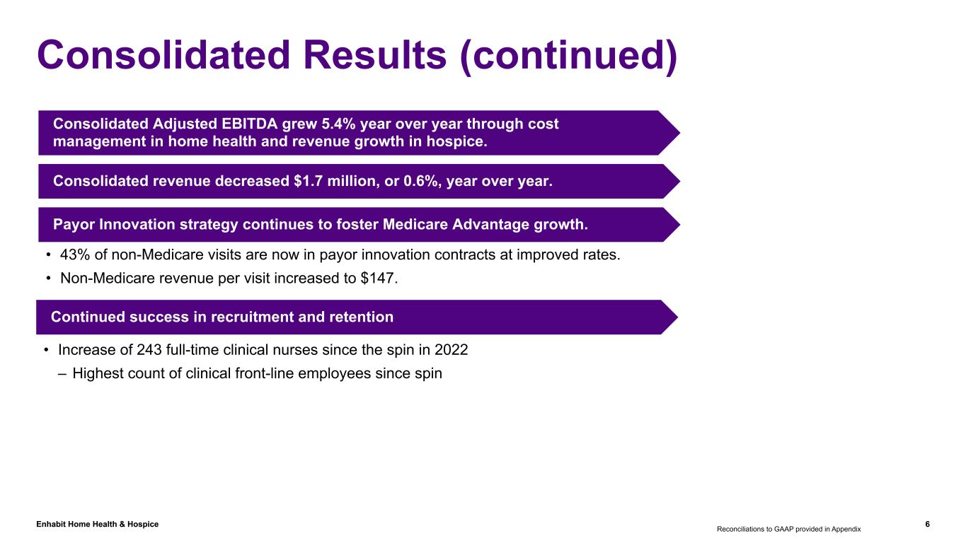 Enhabit Home Health & Hospice 6 Consolidated Results (continued) • 43% of non-Medicare visits are now in payor innovation contracts at improved rates. • Non-Medicare revenue per visit increased to $147. Payor Innovation strategy continues to foster Medicare Advantage growth. Consolidated revenue decreased $1.7 million, or 0.6%, year over year. Reconciliations to GAAP provided in Appendix Continued success in recruitment and retention • Increase of 243 full-time clinical nurses since the spin in 2022 – Highest count of clinical front-line employees since spin Consolidated Adjusted EBITDA grew 5.4% year over year through cost management in home health and revenue growth in hospice.