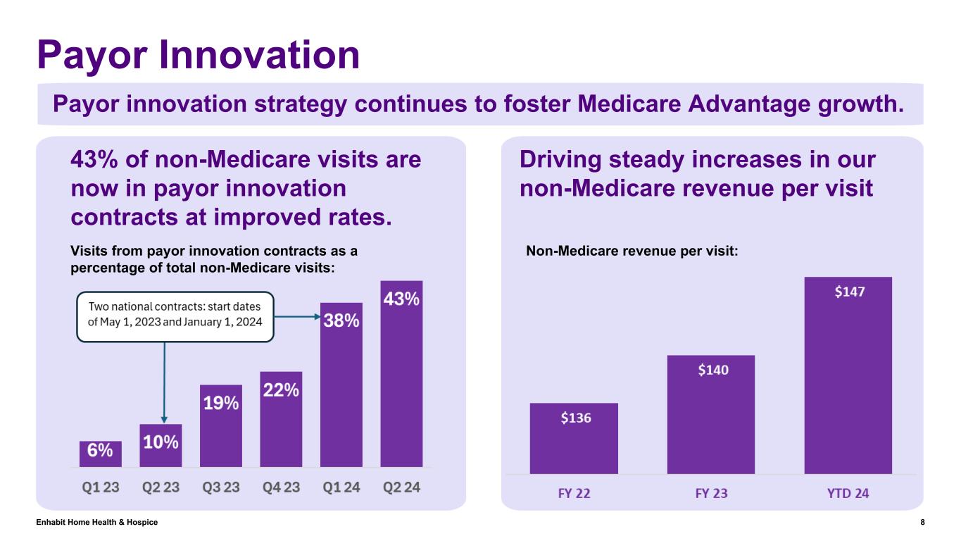 Enhabit Home Health & Hospice 7 Clinical Expertise and High-Quality Outcomes Enhabit National Average % Better Than Average QoPC Star Rating1 3.4 3.0 13.3% 80% of our home health agencies are 3 Stars or higher; 28% are 4 Stars or higher1 HHCAHPS Star Rating2 3.8 3.6 5.6% 99% of our home health agencies are 3 Stars or higher; 74% are 4 Stars or higher2 30-Day Hospital Readmission Rate3 13.5% 17.6% 23.3% % of patients readmitted to an acute care hospital within 30 days of start of care or resumption of care Patient Visits in Last Days of Life4 73.4% 47.9% 53.2% % of patients who received in person visits from RN or medical social worker on at least two out of the final three days of the patient’s life Standardized Protocols Motivated Clinicians Disciplined Use of Technology Superior Performance ü ü ü ü 1) Quality of Patient Care (QoPC) Star Ratings as of July 2024 for dates of service full year 2022; October 2022 through September 2023 2) Home Health Care Consumer Assessment of Healthcare Providers (HHCAHPS) Patient Survey Star Ratings as of July 2024 for dates of service January 1, 2023 - December 31, 2023 3) Research Institute for Home Care 2023 Chartbook (data from Medicare Standard Analytics Files for CY 2022), Enhabit data is as of Q1 2024 4) Medicare fee for service claims data from January 2021 to December 2022 (source Medicare Provider Data catalog - January 2024)