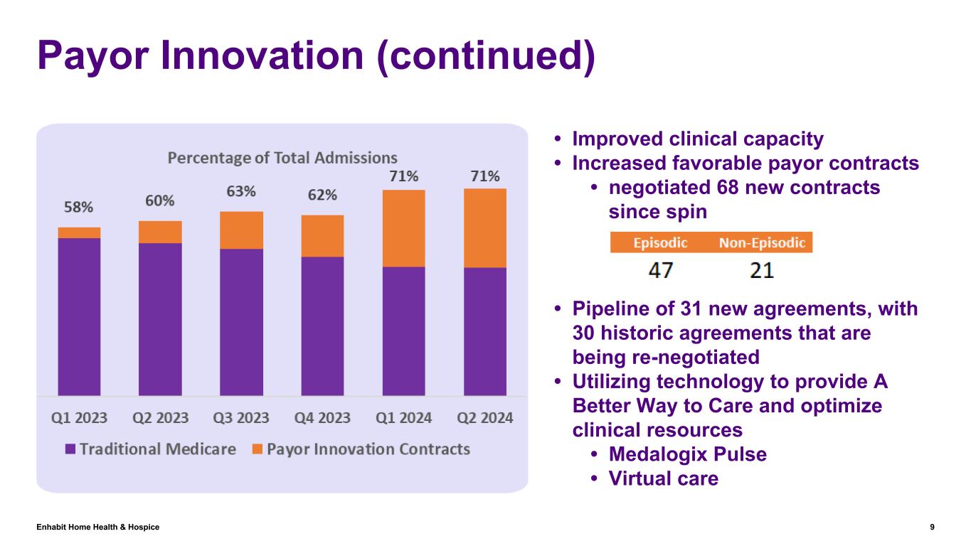 Enhabit Home Health & Hospice 8 Payor Innovation Payor innovation strategy continues to foster Medicare Advantage growth. Driving steady increases in our non-Medicare revenue per visit 43% of non-Medicare visits are now in payor innovation contracts at improved rates. Visits from payor innovation contracts as a percentage of total non-Medicare visits: Non-Medicare revenue per visit: