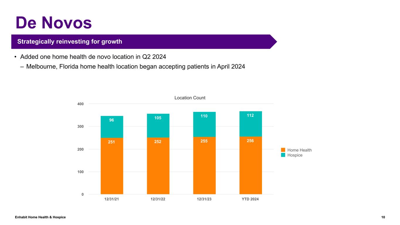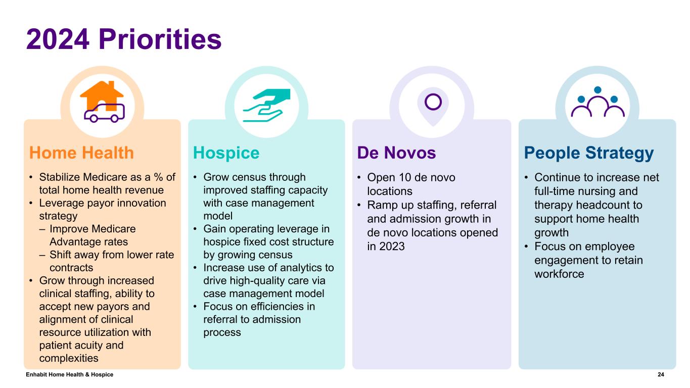 Enhabit Home Health & Hospice 23 Overview 107 hospice locations co-located with home health locations(1) 10 states where we are #1 or #2 in home health(2) ~66% of total Medicare home health spend occurs in states in which we operate(2) Home Health Locations Hospice Locations Home Health & Hospice State Home Health Only State (1) As of June 30, 2024 - due to scale, not all locations can be represented by locational markers (2) Based on 2022 Home Health Medicare revenues 112 Hospice Locations(1) 256 Home Health Locations(1) We are a leading provider of home health and hospice services that strives to provide superior, cost-effective care where patients prefer it: in their homes For over 20 years, we've provided care with high-quality outcomes becoming a trusted partner of health systems, payors and other risk-bearing entities We operate nationally across 34 states with 10,800+ employees We foster an award-winning culture that is a strategic advantage in attracting and retaining talent and a main contributor to our continued success