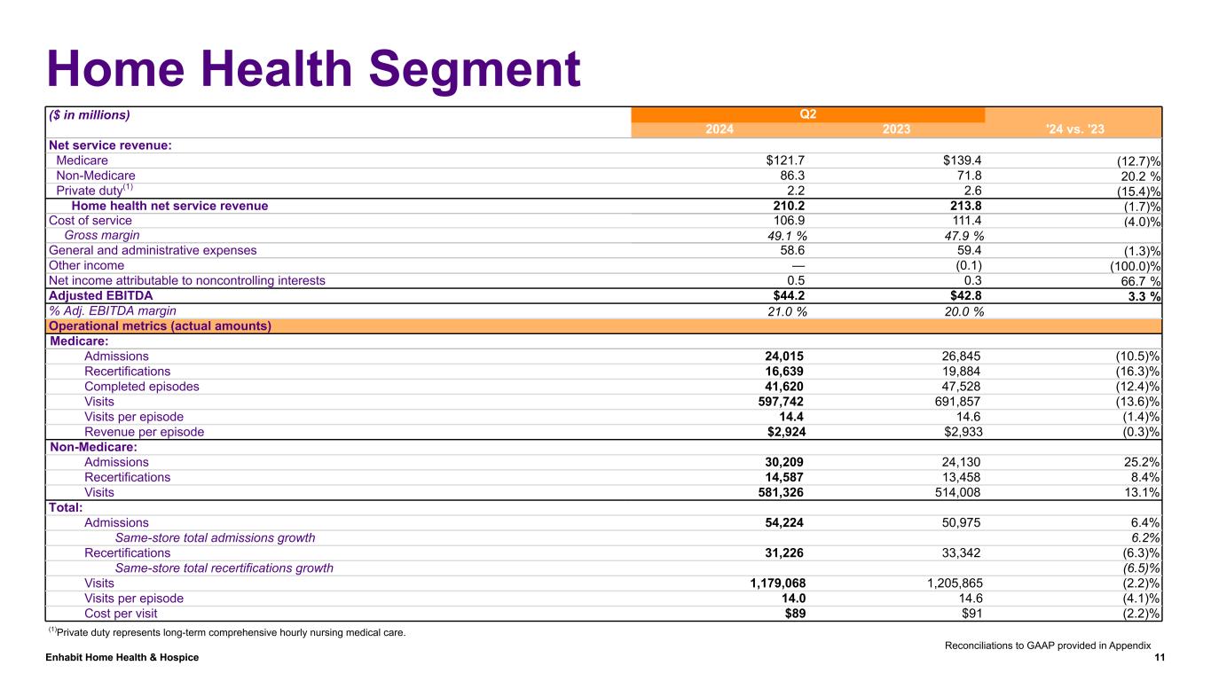 Enhabit Home Health & Hospice 10 De Novos Strategically reinvesting for growth • Added one home health de novo location in Q2 2024 – Melbourne, Florida home health location began accepting patients in April 2024 Home Health Hospice Total December 31, 2020 241 82 323 De Novo Locations Opened 0 3 3 Acquired Locations 11 11 22 Merged/Closed Locations (1) 0 (1) December 31, 2021 251 96 347 De Novo Locations Opened 1 3 4 Acquired Locations 2 6 8 Merged/Closed Locations (2) 0 (2) December 31, 2022 252 105 357 De Novo Locations Opened 2 4 6 Acquired Locations 1 0 1 YTD 2023 255 109 364 251 252 255 256 96 105 110 112 Home Health Hospice 12/31/21 12/31/22 12/31/23 YTD 2024 0 100 200 300 400 Location Count