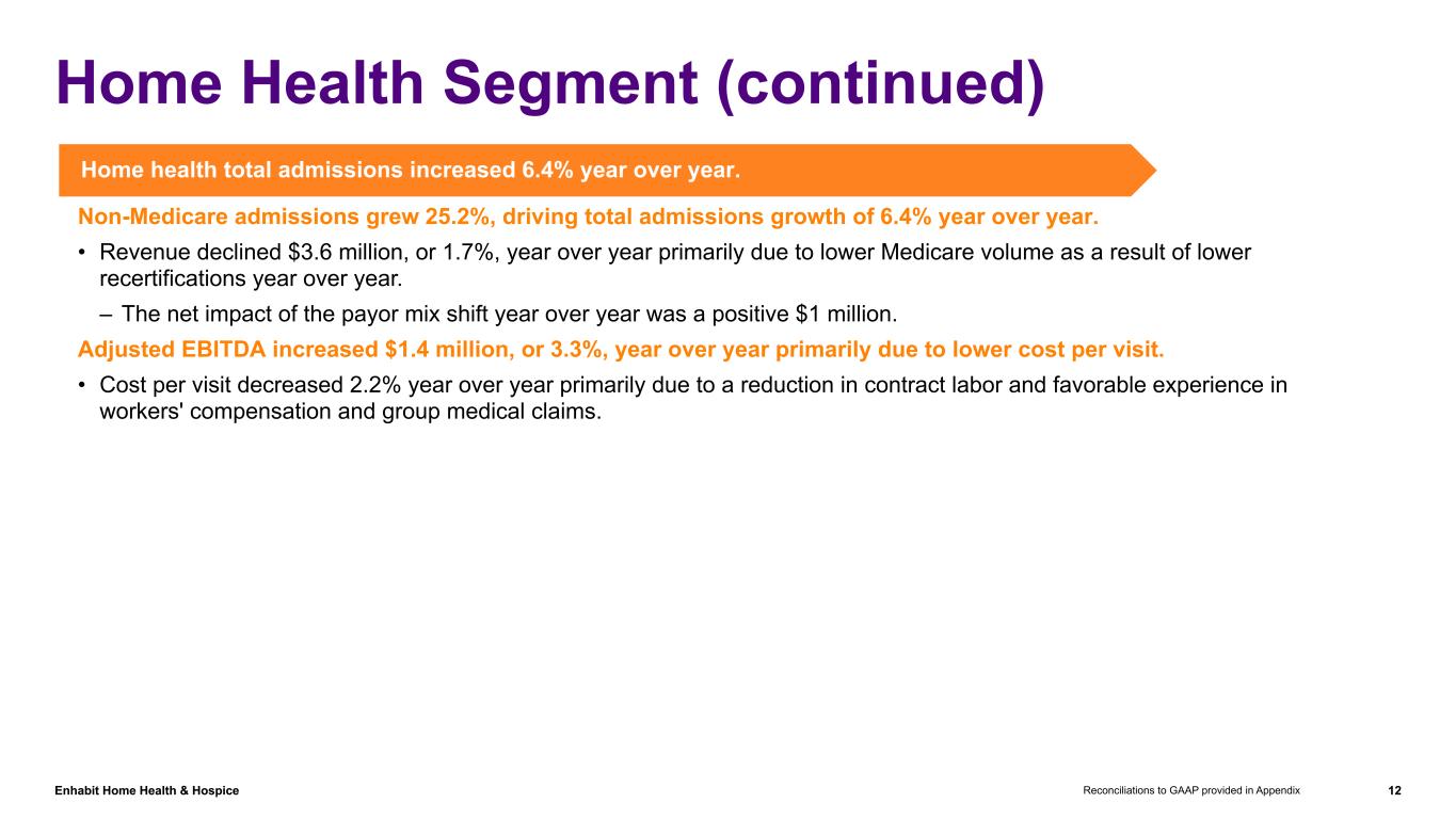Enhabit Home Health & Hospice 11 Home Health Segment ($ in millions) Q2 '24 vs. '232024 2023 Net service revenue: Medicare $121.7 $139.4 (12.7) % Non-Medicare 86.3 71.8 20.2 % Private duty(1) 2.2 2.6 (15.4) % Home health net service revenue 210.2 213.8 (1.7) % Cost of service 106.9 111.4 (4.0) % Gross margin 49.1 % 47.9 % General and administrative expenses 58.6 59.4 (1.3) % Other income — (0.1) (100.0) % Net income attributable to noncontrolling interests 0.5 0.3 66.7 % Adjusted EBITDA $44.2 $42.8 3.3 % % Adj. EBITDA margin 21.0 % 20.0 % Operational metrics (actual amounts) Medicare: Admissions 24,015 26,845 (10.5) % Recertifications 16,639 19,884 (16.3) % Completed episodes 41,620 47,528 (12.4) % Visits 597,742 691,857 (13.6) % Visits per episode 14.4 14.6 (1.4) % Revenue per episode $2,924 $2,933 (0.3) % Non-Medicare: Admissions 30,209 24,130 25.2 % Recertifications 14,587 13,458 8.4 % Visits 581,326 514,008 13.1 % Total: Admissions 54,224 50,975 6.4 % Same-store total admissions growth 6.2 % Recertifications 31,226 33,342 (6.3) % Same-store total recertifications growth (6.5) % Visits 1,179,068 1,205,865 (2.2) % Visits per episode 14.0 14.6 (4.1) % Cost per visit $89 $91 (2.2) % (1)Private duty represents long-term comprehensive hourly nursing medical care. Reconciliations to GAAP provided in Appendix