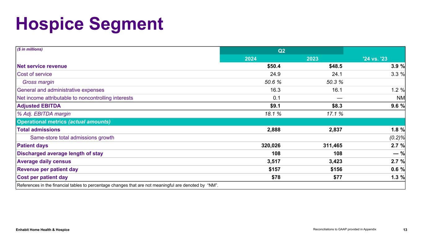 Enhabit Home Health & Hospice 12 Home Health Segment (continued) Non-Medicare admissions grew 25.2%, driving total admissions growth of 6.4% year over year. • Revenue declined $3.6 million, or 1.7%, year over year primarily due to lower Medicare volume as a result of lower recertifications year over year. – The net impact of the payor mix shift year over year was a positive $1 million. Adjusted EBITDA increased $1.4 million, or 3.3%, year over year primarily due to lower cost per visit. • Cost per visit decreased 2.2% year over year primarily due to a reduction in contract labor and favorable experience in workers' compensation and group medical claims. Home health total admissions increased 6.4% year over year. Reconciliations to GAAP provided in Appendix