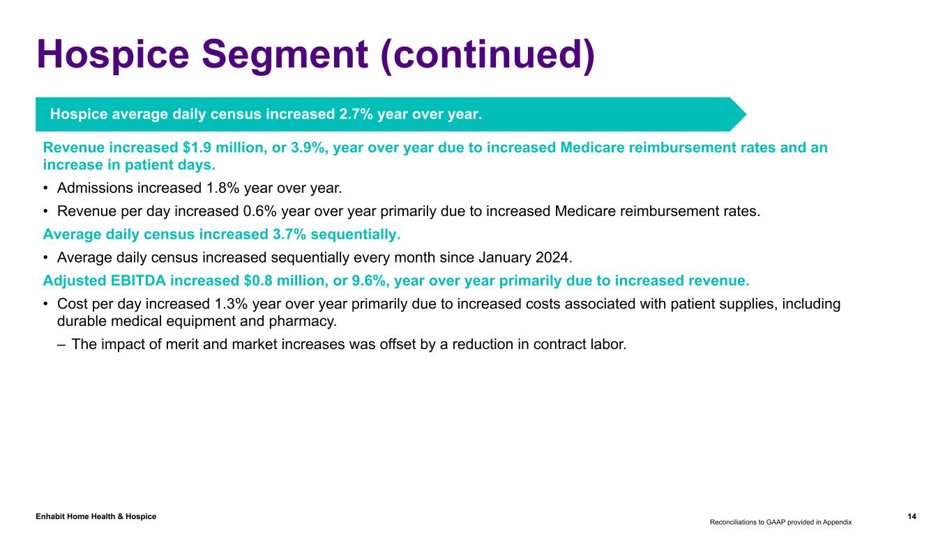 Enhabit Home Health & Hospice 13 Hospice Segment ($ in millions) Q2 '24 vs. '232024 2023 Net service revenue $50.4 $48.5 3.9 % Cost of service 24.9 24.1 3.3 % Gross margin 50.6 % 50.3 % General and administrative expenses 16.3 16.1 1.2 % Net income attributable to noncontrolling interests 0.1 — NM Adjusted EBITDA $9.1 $8.3 9.6 % % Adj. EBITDA margin 18.1 % 17.1 % Operational metrics (actual amounts) Total admissions 2,888 2,837 1.8 % Same-store total admissions growth (0.2) % Patient days 320,026 311,465 2.7 % Discharged average length of stay 108 108 — % Average daily census 3,517 3,423 2.7 % Revenue per patient day $157 $156 0.6 % Cost per patient day $78 $77 1.3 % References in the financial tables to percentage changes that are not meaningful are denoted by “NM”. Reconciliations to GAAP provided in Appendix