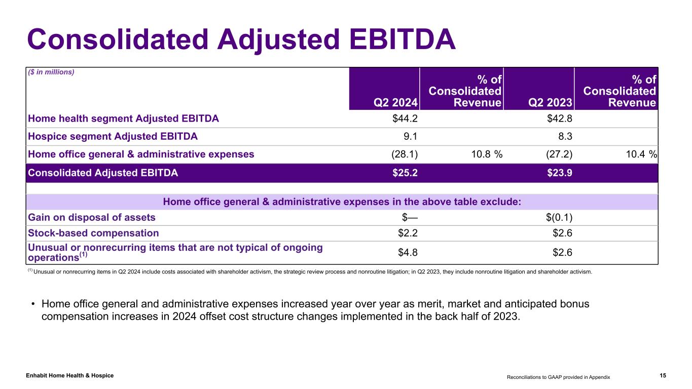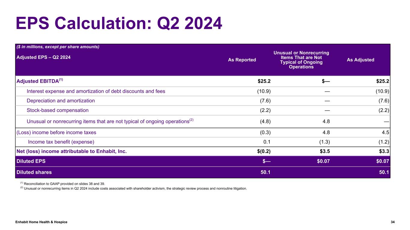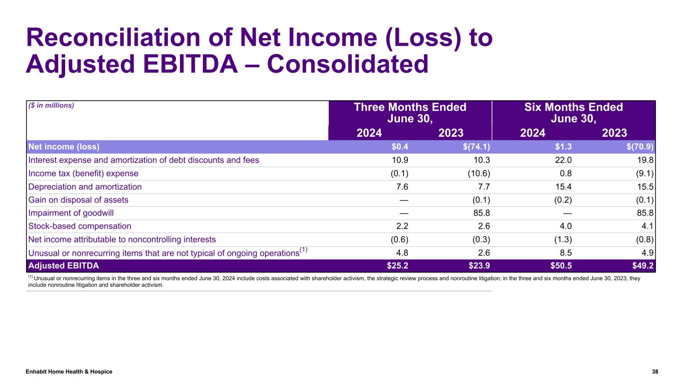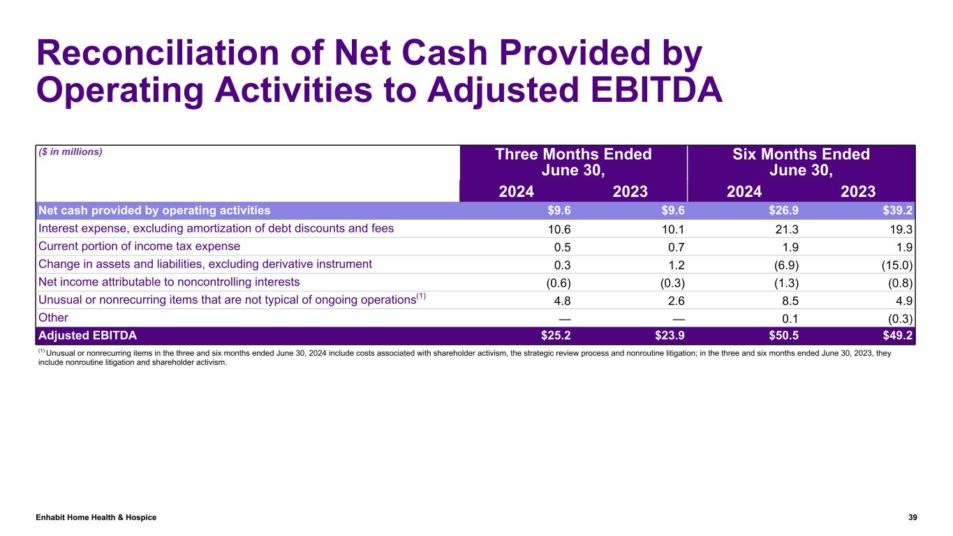 Enhabit Home Health & Hospice 38 Reconciliation of Net Income (Loss) to Adjusted EBITDA – Consolidated ($ in millions) Three Months Ended June 30, Six Months Ended June 30, 2024 2023 2024 2023 Net income (loss) $0.4 $(74.1) $1.3 $(70.9) Interest expense and amortization of debt discounts and fees 10.9 10.3 22.0 19.8 Income tax (benefit) expense (0.1) (10.6) 0.8 (9.1) Depreciation and amortization 7.6 7.7 15.4 15.5 Gain on disposal of assets — (0.1) (0.2) (0.1) Impairment of goodwill — 85.8 — 85.8 Stock-based compensation 2.2 2.6 4.0 4.1 Net income attributable to noncontrolling interests (0.6) (0.3) (1.3) (0.8) Unusual or nonrecurring items that are not typical of ongoing operations(1) 4.8 2.6 8.5 4.9 Adjusted EBITDA $25.2 $23.9 $50.5 $49.2 (1) Unusual or nonrecurring items in the three and six months ended June 30, 2024 include costs associated with shareholder activism, the strategic review process and nonroutine litigation; in the three and six months ended June 30, 2023, they include nonroutine litigation and shareholder activism.