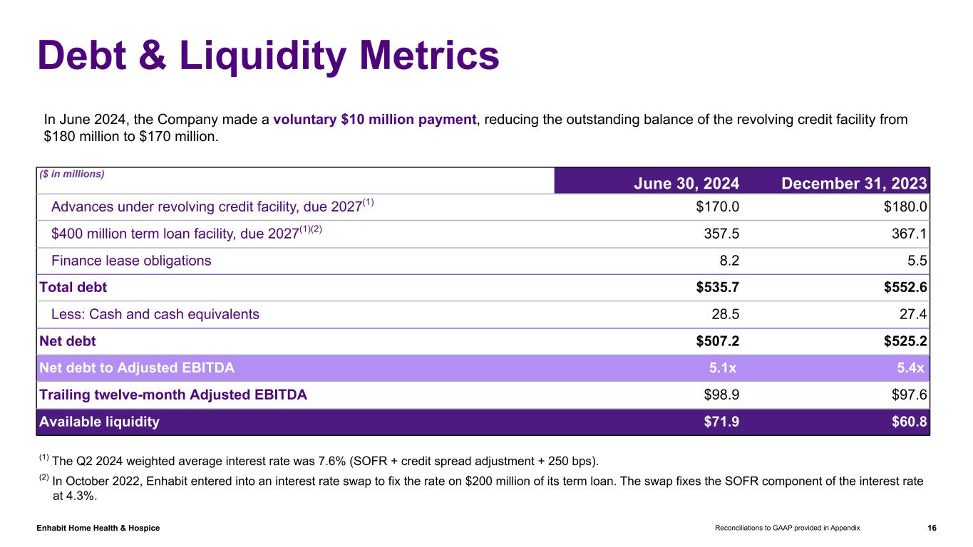 Enhabit Home Health & Hospice 15 Consolidated Adjusted EBITDA ($ in millions) Q2 2024 % of Consolidated Revenue Q2 2023 % of Consolidated Revenue Home health segment Adjusted EBITDA $44.2 $42.8 Hospice segment Adjusted EBITDA 9.1 8.3 Home office general & administrative expenses (28.1) 10.8 % (27.2) 10.4 % Consolidated Adjusted EBITDA $25.2 $23.9 Home office general & administrative expenses in the above table exclude: Gain on disposal of assets $— $(0.1) Stock-based compensation $2.2 $2.6 Unusual or nonrecurring items that are not typical of ongoing operations(1) $4.8 $2.6 (1) Unusual or nonrecurring items in Q2 2024 include costs associated with shareholder activism, the strategic review process and nonroutine litigation; in Q2 2023, they include nonroutine litigation and shareholder activism. Reconciliations to GAAP provided in Appendix • Home office general and administrative expenses increased year over year as merit, market and anticipated bonus compensation increases in 2024 offset cost structure changes implemented in the back half of 2023.