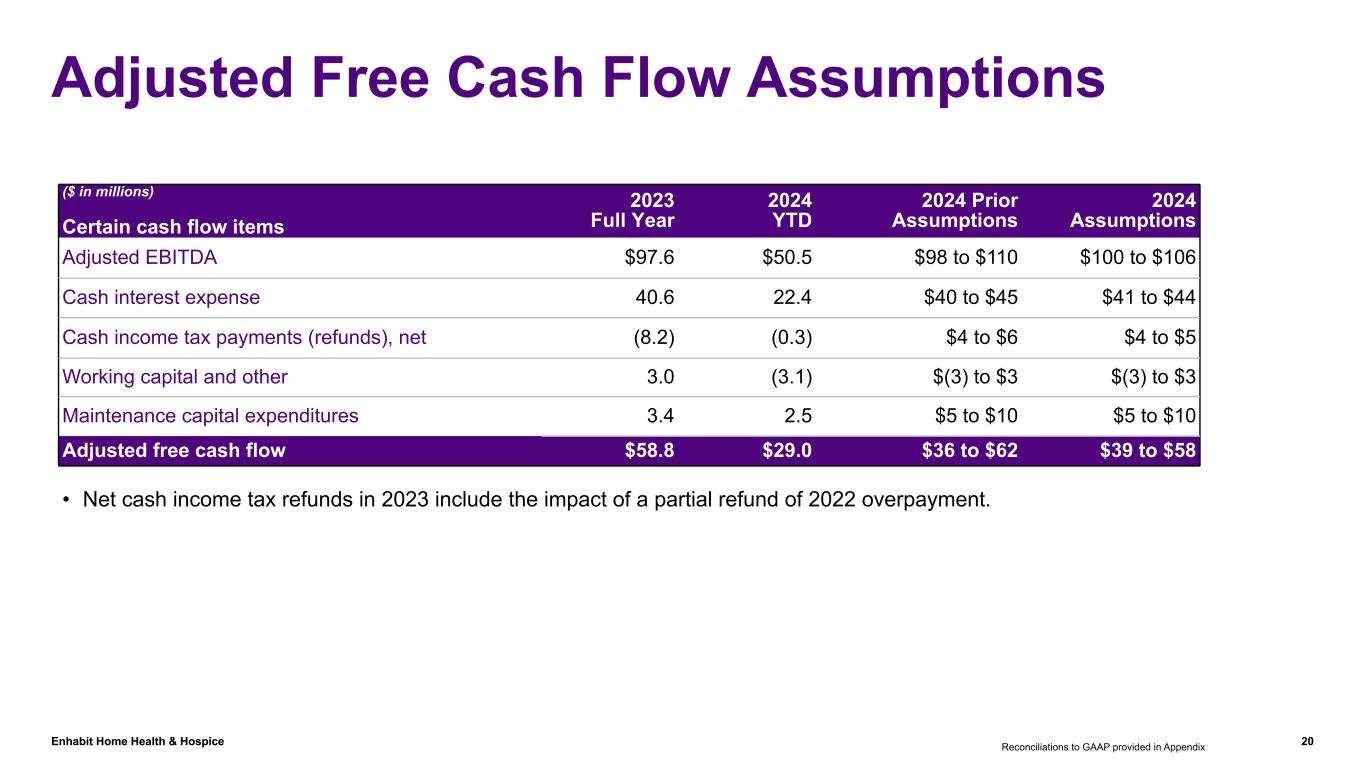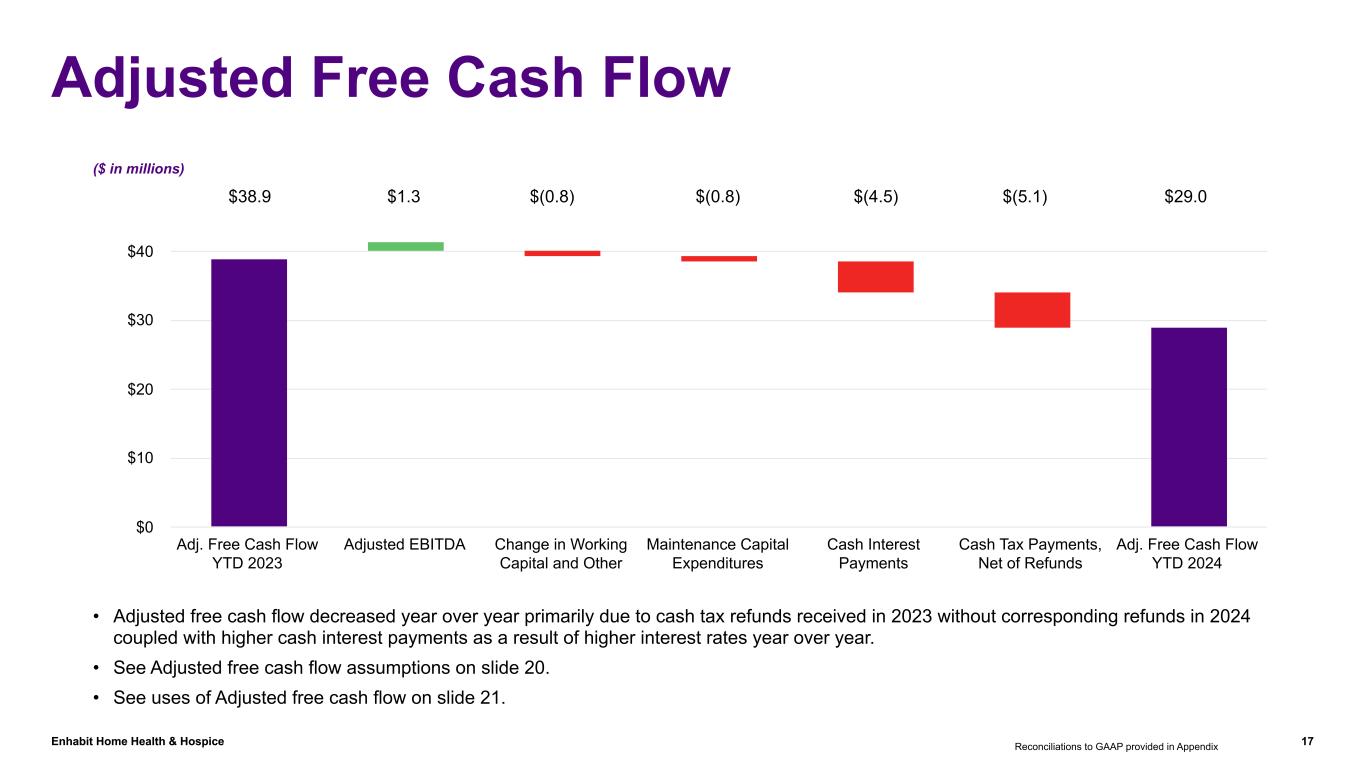 Enhabit Home Health & Hospice 20 Adjusted Free Cash Flow Assumptions ($ in millions) Certain cash flow items 2023 Full Year 2024 YTD 2024 Prior Assumptions 2024 Assumptions Adjusted EBITDA $97.6 $50.5 $98 to $110 $100 to $106 Cash interest expense 40.6 22.4 $40 to $45 $41 to $44 Cash income tax payments (refunds), net (8.2) (0.3) $4 to $6 $4 to $5 Working capital and other 3.0 (3.1) $(3) to $3 $(3) to $3 Maintenance capital expenditures 3.4 2.5 $5 to $10 $5 to $10 Adjusted free cash flow $58.8 $29.0 $36 to $62 $39 to $58 • Net cash income tax refunds in 2023 include the impact of a partial refund of 2022 overpayment. Reconciliations to GAAP provided in Appendix