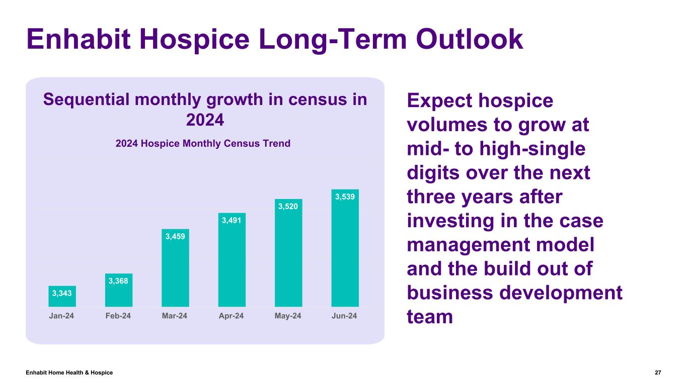 Enhabit Home Health & Hospice 26 Enhabit Home Health Long-Term Outlook Q2 2024 home health admissions continued to grow versus prior year, and we expect to continue growing at mid- to high- single digits over the next three years with our ability to better serve referral sources through improved clinical capacity and payor innovation contracts. Home health admissions have accelerated over the last three quarters Home Health Admissions Growth vs Prior Year 1.2% 3.2% 1.6% 3.9% 5.3% 6.4% —% 1.7% 0.2% 3.2% 5.0% 6.2% Total admissions growth Same-store admissions growth Q1 23 Q2 23 Q3 23 Q4 23 Q1 24 Q2 24