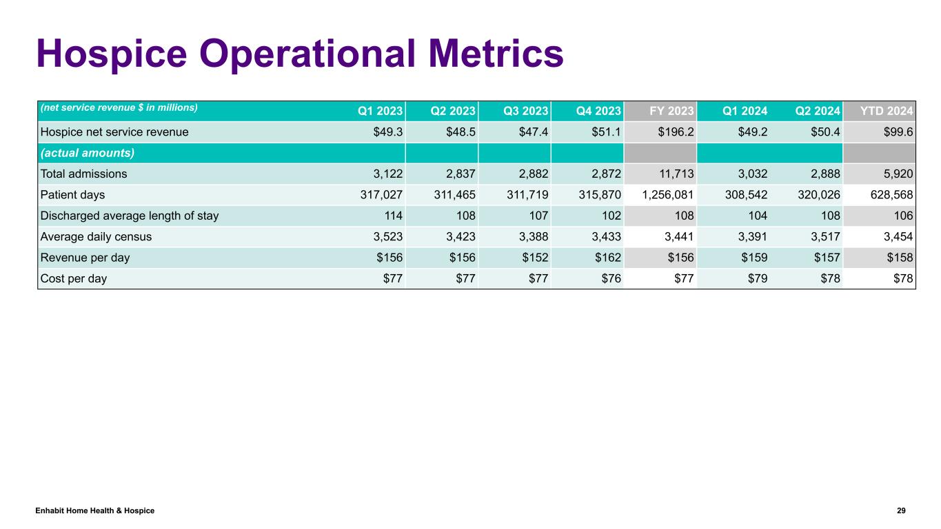 Enhabit Home Health & Hospice 28 Home Health Operational Metrics (net service revenue $ in millions) Q1 2023 Q2 2023 Q3 2023 Q4 2023 FY 2023 Q1 2024 Q2 2024 YTD 2024 Medicare $146.0 $139.4 $141.0 $130.9 $557.3 $128.3 $121.7 $250.0 Non-Medicare 67.1 71.8 67.3 76.8 283.0 82.6 86.3 168.9 Private duty(1) 2.7 2.6 2.6 1.8 9.7 2.3 2.2 4.5 Home health net service revenue $215.8 $213.8 $210.9 $209.5 $850.1 $213.2 $210.2 $423.4 (actual amounts)(1) Medicare: Admissions 29,285 26,845 25,585 25,090 106,805 25,944 24,015 49,959 Recertifications 19,938 19,884 19,321 18,970 78,113 17,652 16,639 34,291 Completed episodes 49,231 47,528 44,350 44,305 185,414 43,171 41,620 84,791 Visits 723,399 691,857 660,380 639,744 2,715,380 632,047 597,742 1,229,789 Visits per episode 14.7 14.6 14.9 14.4 14.6 14.6 14.4 14.5 Revenue per episode $ 2,966 $ 2,933 $ 3,179 $ 2,955 $ 3,006 $ 2,972 $ 2,924 $ 2,948 Non-Medicare: Admissions 24,658 24,130 24,938 26,917 100,643 30,881 30,209 61,090 Recertifications 11,840 13,458 13,411 13,058 51,767 13,489 14,587 28,076 Visits 482,301 514,008 501,764 522,641 2,020,714 571,289 581,326 1,152,615 Total: Admissions 53,943 50,975 50,523 52,007 207,448 56,825 54,224 111,049 Recertifications 31,778 33,342 32,732 32,028 129,880 31,141 31,226 62,367 Visits 1,205,700 1,205,865 1,162,144 1,162,385 4,736,094 1,203,336 1,179,068 2,382,404 Visits per episode 14.8 14.6 14.9 14.3 14.6 14.9 14.0 14.5 Cost per visit $ 88 $ 91 $ 93 $ 92 $ 91 $ 90 $ 89 $ 90 (1) Private duty represents long-term comprehensive hourly nursing medical care.