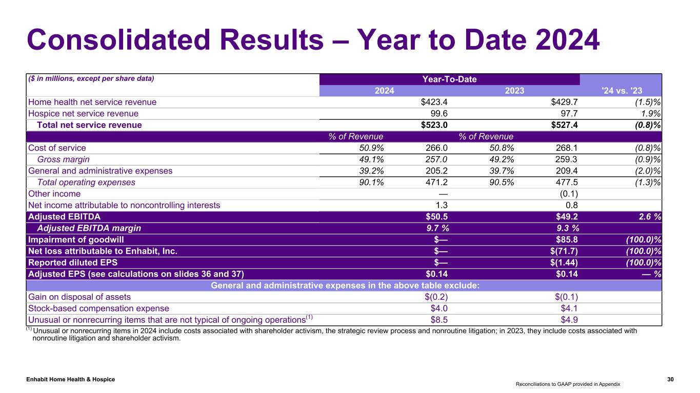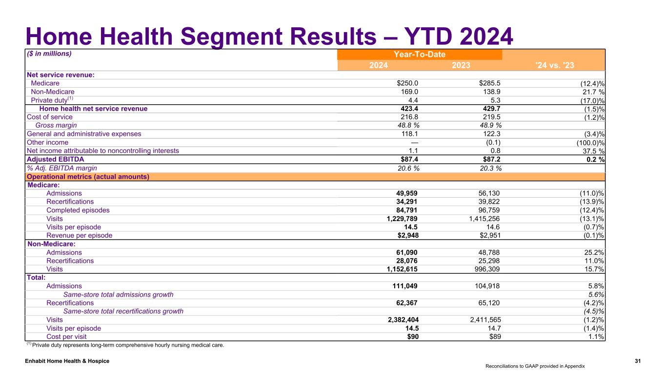 Enhabit Home Health & Hospice 30 Consolidated Results – Year to Date 2024 ($ in millions, except per share data) Year-To-Date '24 vs. '232024 2023 Home health net service revenue $423.4 $429.7 (1.5) % Hospice net service revenue 99.6 97.7 1.9 % Total net service revenue $523.0 $527.4 (0.8) % % of Revenue % of Revenue Cost of service 50.9 % 266.0 50.8 % 268.1 (0.8) % Gross margin 49.1 % 257.0 49.2 % 259.3 (0.9) % General and administrative expenses 39.2 % 205.2 39.7 % 209.4 (2.0) % Total operating expenses 90.1 % 471.2 90.5 % 477.5 (1.3) % Other income — (0.1) Net income attributable to noncontrolling interests 1.3 0.8 Adjusted EBITDA $50.5 $49.2 2.6 % Adjusted EBITDA margin 9.7 % 9.3 % Impairment of goodwill $— $85.8 (100.0) % Net loss attributable to Enhabit, Inc. $— $(71.7) (100.0) % Reported diluted EPS $— $(1.44) (100.0) % Adjusted EPS (see calculations on slides 36 and 37) $0.14 $0.14 — % General and administrative expenses in the above table exclude: Gain on disposal of assets $(0.2) $(0.1) Stock-based compensation expense $4.0 $4.1 Unusual or nonrecurring items that are not typical of ongoing operations(1) $8.5 $4.9 (1) Unusual or nonrecurring items in 2024 include costs associated with shareholder activism, the strategic review process and nonroutine litigation; in 2023, they include costs associated with nonroutine litigation and shareholder activism. Reconciliations to GAAP provided in Appendix