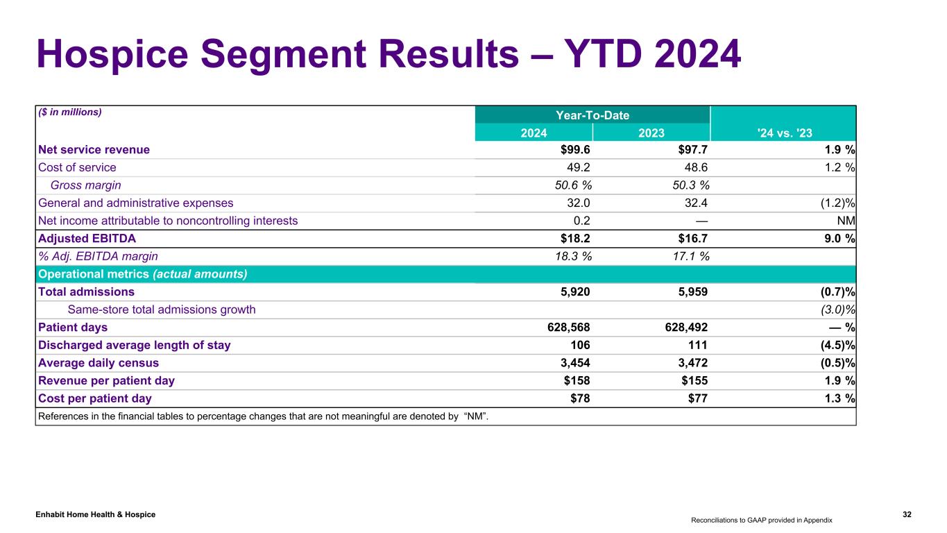 Enhabit Home Health & Hospice 31 Home Health Segment Results – YTD 2024 ($ in millions) Year-To-Date '24 vs. '232024 2023 Net service revenue: Medicare $250.0 $285.5 (12.4) % Non-Medicare 169.0 138.9 21.7 % Private duty(1) 4.4 5.3 (17.0) % Home health net service revenue 423.4 429.7 (1.5) % Cost of service 216.8 219.5 (1.2) % Gross margin 48.8 % 48.9 % General and administrative expenses 118.1 122.3 (3.4) % Other income — (0.1) (100.0) % Net income attributable to noncontrolling interests 1.1 0.8 37.5 % Adjusted EBITDA $87.4 $87.2 0.2 % % Adj. EBITDA margin 20.6 % 20.3 % Operational metrics (actual amounts) Medicare: Admissions 49,959 56,130 (11.0) % Recertifications 34,291 39,822 (13.9) % Completed episodes 84,791 96,759 (12.4) % Visits 1,229,789 1,415,256 (13.1) % Visits per episode 14.5 14.6 (0.7) % Revenue per episode $2,948 $2,951 (0.1) % Non-Medicare: Admissions 61,090 48,788 25.2 % Recertifications 28,076 25,298 11.0 % Visits 1,152,615 996,309 15.7 % Total: Admissions 111,049 104,918 5.8 % Same-store total admissions growth 5.6 % Recertifications 62,367 65,120 (4.2) % Same-store total recertifications growth (4.5) % Visits 2,382,404 2,411,565 (1.2) % Visits per episode 14.5 14.7 (1.4) % Cost per visit $90 $89 1.1 % (1) Private duty represents long-term comprehensive hourly nursing medical care. Reconciliations to GAAP provided in Appendix