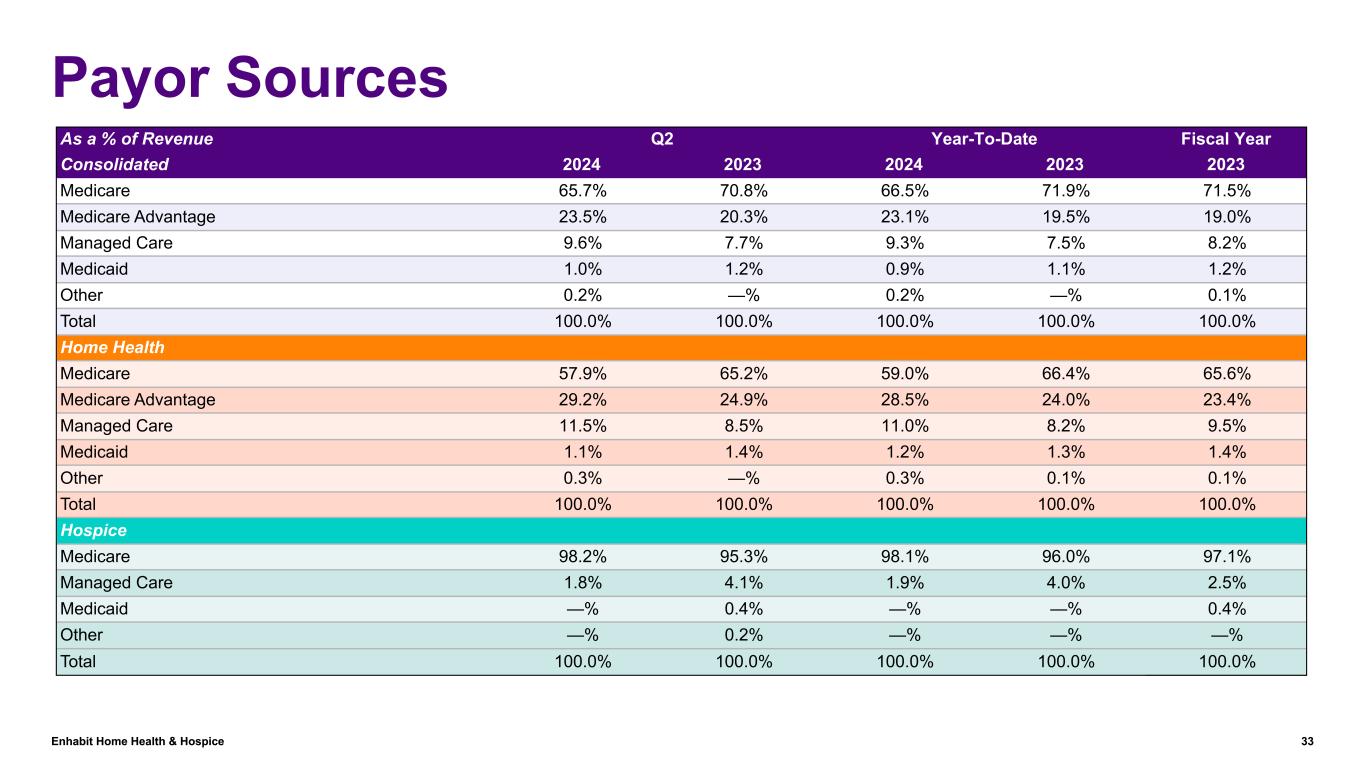 Enhabit Home Health & Hospice 33 Payor Sources As a % of Revenue Q2 Year-To-Date Fiscal Year Consolidated 2024 2023 2024 2023 2023 Medicare 65.7% 70.8% 66.5% 71.9% 71.5% Medicare Advantage 23.5% 20.3% 23.1% 19.5% 19.0% Managed Care 9.6% 7.7% 9.3% 7.5% 8.2% Medicaid 1.0% 1.2% 0.9% 1.1% 1.2% Other 0.2% —% 0.2% —% 0.1% Total 100.0% 100.0% 100.0% 100.0% 100.0% Home Health Medicare 57.9% 65.2% 59.0% 66.4% 65.6% Medicare Advantage 29.2% 24.9% 28.5% 24.0% 23.4% Managed Care 11.5% 8.5% 11.0% 8.2% 9.5% Medicaid 1.1% 1.4% 1.2% 1.3% 1.4% Other 0.3% —% 0.3% 0.1% 0.1% Total 100.0% 100.0% 100.0% 100.0% 100.0% Hospice Medicare 98.2% 95.3% 98.1% 96.0% 97.1% Managed Care 1.8% 4.1% 1.9% 4.0% 2.5% Medicaid —% 0.4% —% —% 0.4% Other —% 0.2% —% —% —% Total 100.0% 100.0% 100.0% 100.0% 100.0%