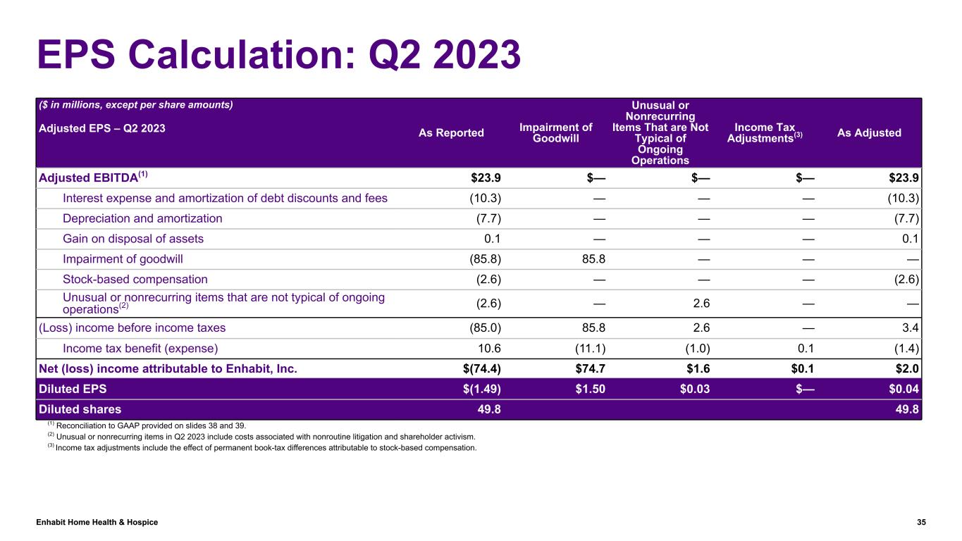 Enhabit Home Health & Hospice 34 EPS Calculation: Q2 2024 ($ in millions, except per share amounts) Adjusted EPS – Q2 2024 As Reported Unusual or Nonrecurring Items That are Not Typical of Ongoing Operations As Adjusted Adjusted EBITDA(1) $25.2 $— $25.2 Interest expense and amortization of debt discounts and fees (10.9) — (10.9) Depreciation and amortization (7.6) — (7.6) Stock-based compensation (2.2) — (2.2) Unusual or nonrecurring items that are not typical of ongoing operations(2) (4.8) 4.8 — (Loss) income before income taxes (0.3) 4.8 4.5 Income tax benefit (expense) 0.1 (1.3) (1.2) Net (loss) income attributable to Enhabit, Inc. $(0.2) $3.5 $3.3 Diluted EPS $— $0.07 $0.07 Diluted shares 50.1 50.1 (1) Reconciliation to GAAP provided on slides 38 and 39. (2) Unusual or nonrecurring items in Q2 2024 include costs associated with shareholder activism, the strategic review process and nonroutine litigation.