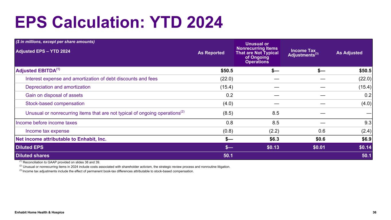 Enhabit Home Health & Hospice 35 EPS Calculation: Q2 2023 ($ in millions, except per share amounts) Adjusted EPS – Q2 2023 As Reported Impairment of Goodwill Unusual or Nonrecurring Items That are Not Typical of Ongoing Operations Income Tax Adjustments(3) As Adjusted Adjusted EBITDA(1) $23.9 $— $— $— $23.9 Interest expense and amortization of debt discounts and fees (10.3) — — — (10.3) Depreciation and amortization (7.7) — — — (7.7) Gain on disposal of assets 0.1 — — — 0.1 Impairment of goodwill (85.8) 85.8 — — — Stock-based compensation (2.6) — — — (2.6) Unusual or nonrecurring items that are not typical of ongoing operations(2) (2.6) — 2.6 — — (Loss) income before income taxes (85.0) 85.8 2.6 — 3.4 Income tax benefit (expense) 10.6 (11.1) (1.0) 0.1 (1.4) Net (loss) income attributable to Enhabit, Inc. $(74.4) $74.7 $1.6 $0.1 $2.0 Diluted EPS $(1.49) $1.50 $0.03 $— $0.04 Diluted shares 49.8 49.8 (1) Reconciliation to GAAP provided on slides 38 and 39. (2) Unusual or nonrecurring items in Q2 2023 include costs associated with nonroutine litigation and shareholder activism. (3) Income tax adjustments include the effect of permanent book-tax differences attributable to stock-based compensation.