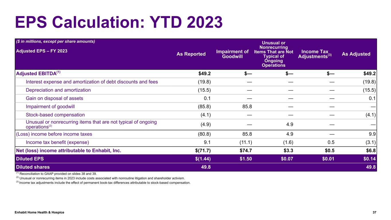 Enhabit Home Health & Hospice 36 EPS Calculation: YTD 2024 ($ in millions, except per share amounts) Adjusted EPS – YTD 2024 As Reported Unusual or Nonrecurring Items That are Not Typical of Ongoing Operations Income Tax Adjustments(3) As Adjusted Adjusted EBITDA(1) $50.5 $— $— $50.5 Interest expense and amortization of debt discounts and fees (22.0) — — (22.0) Depreciation and amortization (15.4) — — (15.4) Gain on disposal of assets 0.2 — — 0.2 Stock-based compensation (4.0) — — (4.0) Unusual or nonrecurring items that are not typical of ongoing operations(2) (8.5) 8.5 — — Income before income taxes 0.8 8.5 — 9.3 Income tax expense (0.8) (2.2) 0.6 (2.4) Net income attributable to Enhabit, Inc. $— $6.3 $0.6 $6.9 Diluted EPS $— $0.13 $0.01 $0.14 Diluted shares 50.1 50.1 (1) Reconciliation to GAAP provided on slides 38 and 39. (2) Unusual or nonrecurring items in 2024 include costs associated with shareholder activism, the strategic review process and nonroutine litigation. (3) Income tax adjustments include the effect of permanent book-tax differences attributable to stock-based compensation.