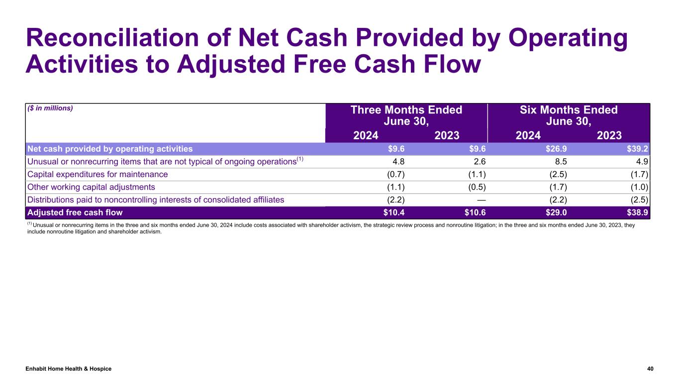 Enhabit Home Health & Hospice 39 Reconciliation of Net Cash Provided by Operating Activities to Adjusted EBITDA ($ in millions) Three Months Ended June 30, Six Months Ended June 30, 2024 2023 2024 2023 Net cash provided by operating activities $9.6 $9.6 $26.9 $39.2 Interest expense, excluding amortization of debt discounts and fees 10.6 10.1 21.3 19.3 Current portion of income tax expense 0.5 0.7 1.9 1.9 Change in assets and liabilities, excluding derivative instrument 0.3 1.2 (6.9) (15.0) Net income attributable to noncontrolling interests (0.6) (0.3) (1.3) (0.8) Unusual or nonrecurring items that are not typical of ongoing operations(1) 4.8 2.6 8.5 4.9 Other — — 0.1 (0.3) Adjusted EBITDA $25.2 $23.9 $50.5 $49.2 (1) Unusual or nonrecurring items in the three and six months ended June 30, 2024 include costs associated with shareholder activism, the strategic review process and nonroutine litigation; in the three and six months ended June 30, 2023, they include nonroutine litigation and shareholder activism.