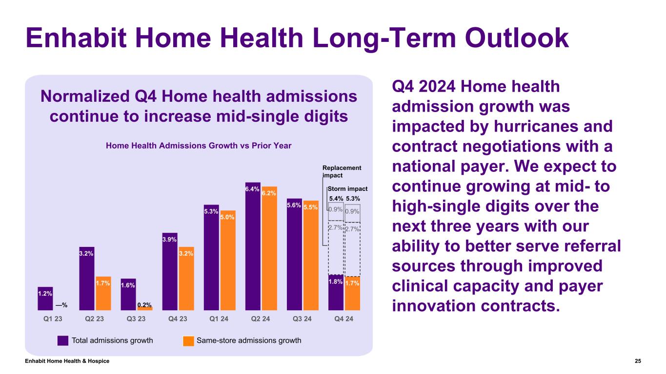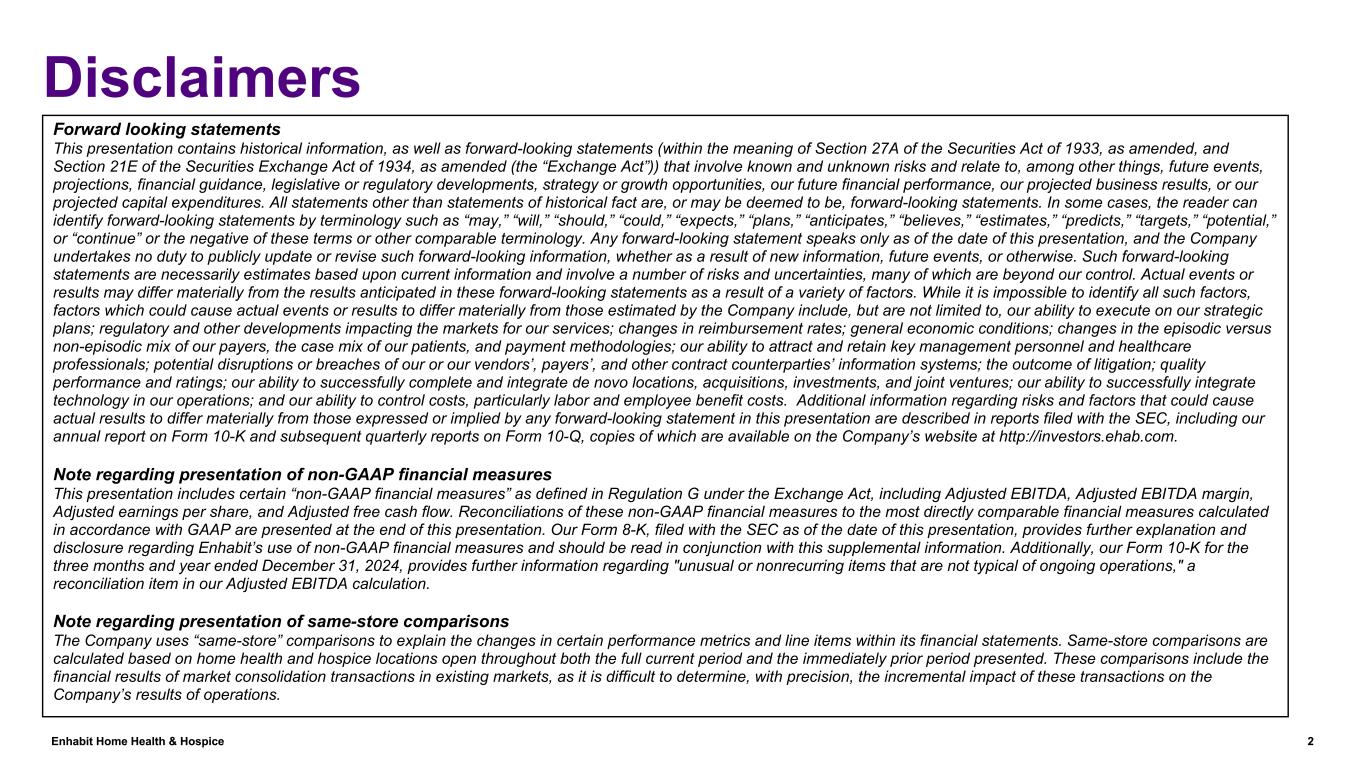 Enhabit Home Health & Hospice 2 Disclaimers Forward looking statements This presentation contains historical information, as well as forward-looking statements (within the meaning of Section 27A of the Securities Act of 1933, as amended, and Section 21E of the Securities Exchange Act of 1934, as amended (the “Exchange Act”)) that involve known and unknown risks and relate to, among other things, future events, projections, financial guidance, legislative or regulatory developments, strategy or growth opportunities, our future financial performance, our projected business results, or our projected capital expenditures. All statements other than statements of historical fact are, or may be deemed to be, forward-looking statements. In some cases, the reader can identify forward-looking statements by terminology such as “may,” “will,” “should,” “could,” “expects,” “plans,” “anticipates,” “believes,” “estimates,” “predicts,” “targets,” “potential,” or “continue” or the negative of these terms or other comparable terminology. Any forward-looking statement speaks only as of the date of this presentation, and the Company undertakes no duty to publicly update or revise such forward-looking information, whether as a result of new information, future events, or otherwise. Such forward-looking statements are necessarily estimates based upon current information and involve a number of risks and uncertainties, many of which are beyond our control. Actual events or results may differ materially from the results anticipated in these forward-looking statements as a result of a variety of factors. While it is impossible to identify all such factors, factors which could cause actual events or results to differ materially from those estimated by the Company include, but are not limited to, our ability to execute on our strategic plans; regulatory and other developments impacting the markets for our services; changes in reimbursement rates; general economic conditions; changes in the episodic versus non-episodic mix of our payers, the case mix of our patients, and payment methodologies; our ability to attract and retain key management personnel and healthcare professionals; potential disruptions or breaches of our or our vendors’, payers’, and other contract counterparties’ information systems; the outcome of litigation; quality performance and ratings; our ability to successfully complete and integrate de novo locations, acquisitions, investments, and joint ventures; our ability to successfully integrate technology in our operations; and our ability to control costs, particularly labor and employee benefit costs. Additional information regarding risks and factors that could cause actual results to differ materially from those expressed or implied by any forward-looking statement in this presentation are described in reports filed with the SEC, including our annual report on Form 10-K and subsequent quarterly reports on Form 10-Q, copies of which are available on the Company’s website at http://investors.ehab.com. Note regarding presentation of non-GAAP financial measures This presentation includes certain “non-GAAP financial measures” as defined in Regulation G under the Exchange Act, including Adjusted EBITDA, Adjusted EBITDA margin, Adjusted earnings per share, and Adjusted free cash flow. Reconciliations of these non-GAAP financial measures to the most directly comparable financial measures calculated in accordance with GAAP are presented at the end of this presentation. Our Form 8-K, filed with the SEC as of the date of this presentation, provides further explanation and disclosure regarding Enhabit’s use of non-GAAP financial measures and should be read in conjunction with this supplemental information. Additionally, our Form 10-K for the three months and year ended December 31, 2024, provides further information regarding "unusual or nonrecurring items that are not typical of ongoing operations," a reconciliation item in our Adjusted EBITDA calculation. Note regarding presentation of same-store comparisons The Company uses “same-store” comparisons to explain the changes in certain performance metrics and line items within its financial statements. Same-store comparisons are calculated based on home health and hospice locations open throughout both the full current period and the immediately prior period presented. These comparisons include the financial results of market consolidation transactions in existing markets, as it is difficult to determine, with precision, the incremental impact of these transactions on the Company’s results of operations.