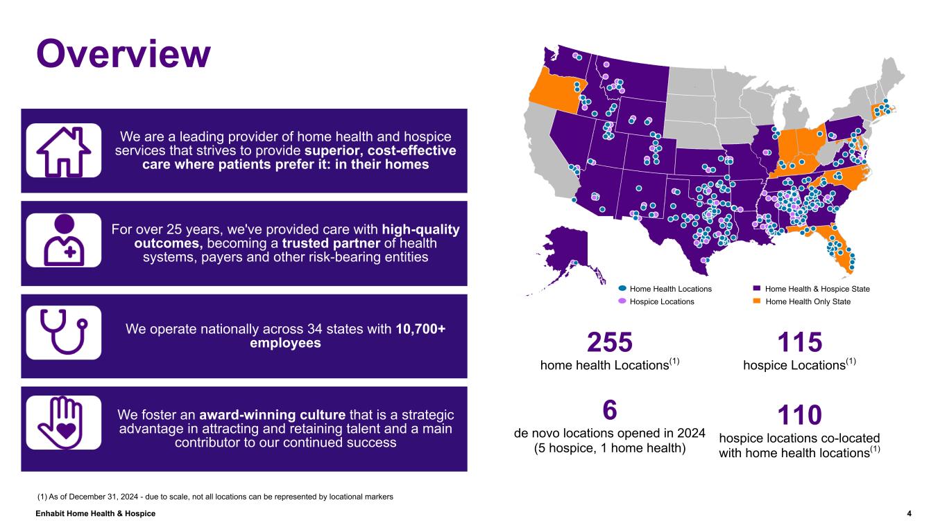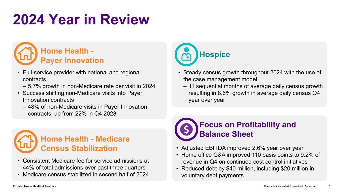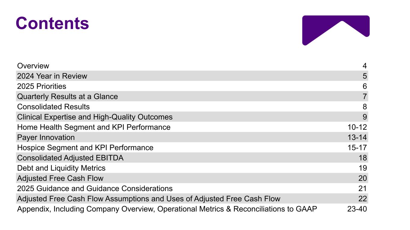 Contents Overview 4 2024 Year in Review 5 2025 Priorities 6 Quarterly Results at a Glance 7 Consolidated Results 8 Clinical Expertise and High-Quality Outcomes 9 Home Health Segment and KPI Performance 10-12 Payer Innovation 13-14 Hospice Segment and KPI Performance 15-17 Consolidated Adjusted EBITDA 18 Debt and Liquidity Metrics 19 Adjusted Free Cash Flow 20 2025 Guidance and Guidance Considerations 21 Adjusted Free Cash Flow Assumptions and Uses of Adjusted Free Cash Flow 22 Appendix, Including Company Overview, Operational Metrics & Reconciliations to GAAP 23-40