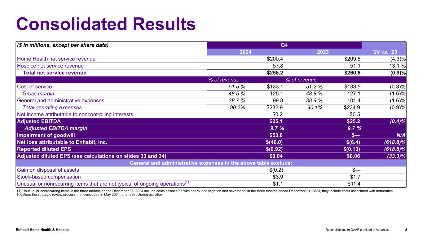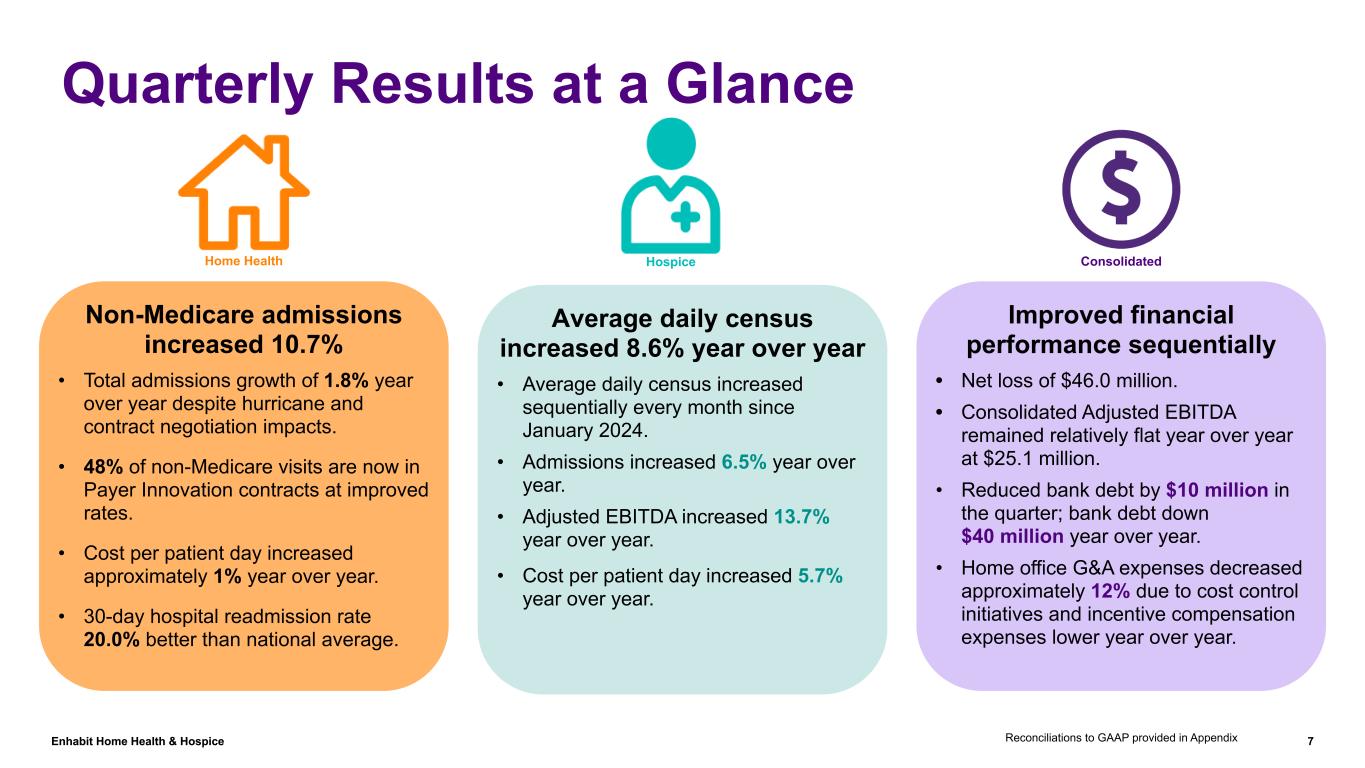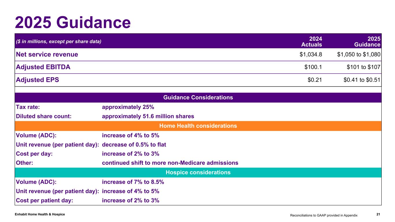 Contents Overview 4 2024 Year in Review 5 2025 Priorities 6 Quarterly Results at a Glance 7 Consolidated Results 8 Clinical Expertise and High-Quality Outcomes 9 Home Health Segment and KPI Performance 10-12 Payer Innovation 13-14 Hospice Segment and KPI Performance 15-17 Consolidated Adjusted EBITDA 18 Debt and Liquidity Metrics 19 Adjusted Free Cash Flow 20 2025 Guidance and Guidance Considerations 21 Adjusted Free Cash Flow Assumptions and Uses of Adjusted Free Cash Flow 22 Appendix, Including Company Overview, Operational Metrics & Reconciliations to GAAP 23-40