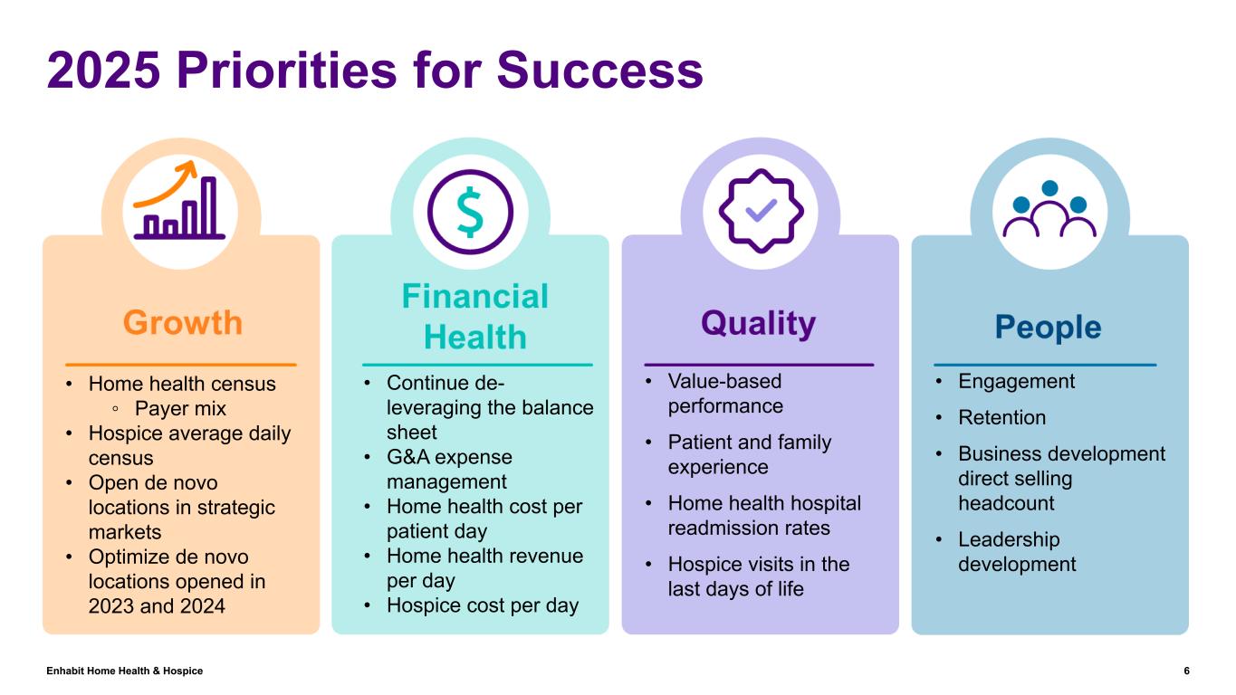 Enhabit Home Health & Hospice 5 2024 Year in Review Home Health - Payer Innovation Home Health - Medicare Census Stabilization Hospice Focus on Profitability and Balance Sheet • Consistent Medicare fee for service admissions at 44% of total admissions over past three quarters • Medicare census stabilized in second half of 2024 • Steady census growth throughout 2024 with the use of the case management model – 11 sequential months of average daily census growth resulting in 8.6% growth in average daily census Q4 year over year • Full-service provider with national and regional contracts – 5.7% growth in non-Medicare rate per visit in 2024 • Success shifting non-Medicare visits into Payer Innovation contracts – 48% of non-Medicare visits in Payer Innovation contracts, up from 22% in Q4 2023 • Adjusted EBITDA improved 2.6% year over year • Home office G&A improved 110 basis points to 9.2% of revenue in Q4 on continued cost control initiatives • Reduced debt by $40 million, including $20 million in voluntary debt payments Reconciliations to GAAP provided in Appendix