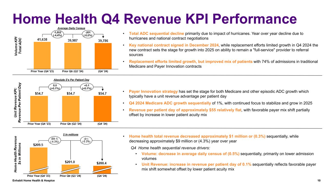 Enhabit Home Health & Hospice 9 Clinical Expertise and High-Quality Outcomes Enhabit National Average % Better Than Average QoPC Star Rating1 3.1 3.0 3.3% 69% of our home health agencies are 3 Stars or higher; 18% are 4 Stars or higher1 HHCAHPS Star Rating2 4.1 3.9 5.1% 99% of our home health agencies are 3 Stars or higher; 82% are 4 Stars or higher2 30-Day Hospital Readmission Rate3 14.4% 18.0% 20.0% Percent of patients readmitted to an acute care hospital within 30 days of start of care or resumption of care Hospice Visits in Last Days of Life4 67.1% 47.4% 41.6% Percent of patients who received in person visits from RN or medical social worker on at least two out of the final three days of the patient’s life Standardized Protocols Motivated Clinicians Disciplined Use of Technology Superior Performance ü ü ü ü (1) Quality of Patient Care (QoPC) Star Ratings as of January 31, 2025 for dates of service current year 2023; April 2023 through March 2024 (2) Home Health Care Consumer Assessment of Healthcare Providers (HHCAHPS) Patient Survey Star Ratings as of January 31, 2025 for dates of service July 1, 2023 - June 30, 2024 (3) Research Institute for Home Care 2024 Chartbook (data from Medicare Standard Analytics Files for CY 2023), Enhabit data is as of Q4 2024 (4) Medicare fee for service claims data from January 1, 2022 to December 31, 2023 (source Medicare Provider Data catalog - February 2025)