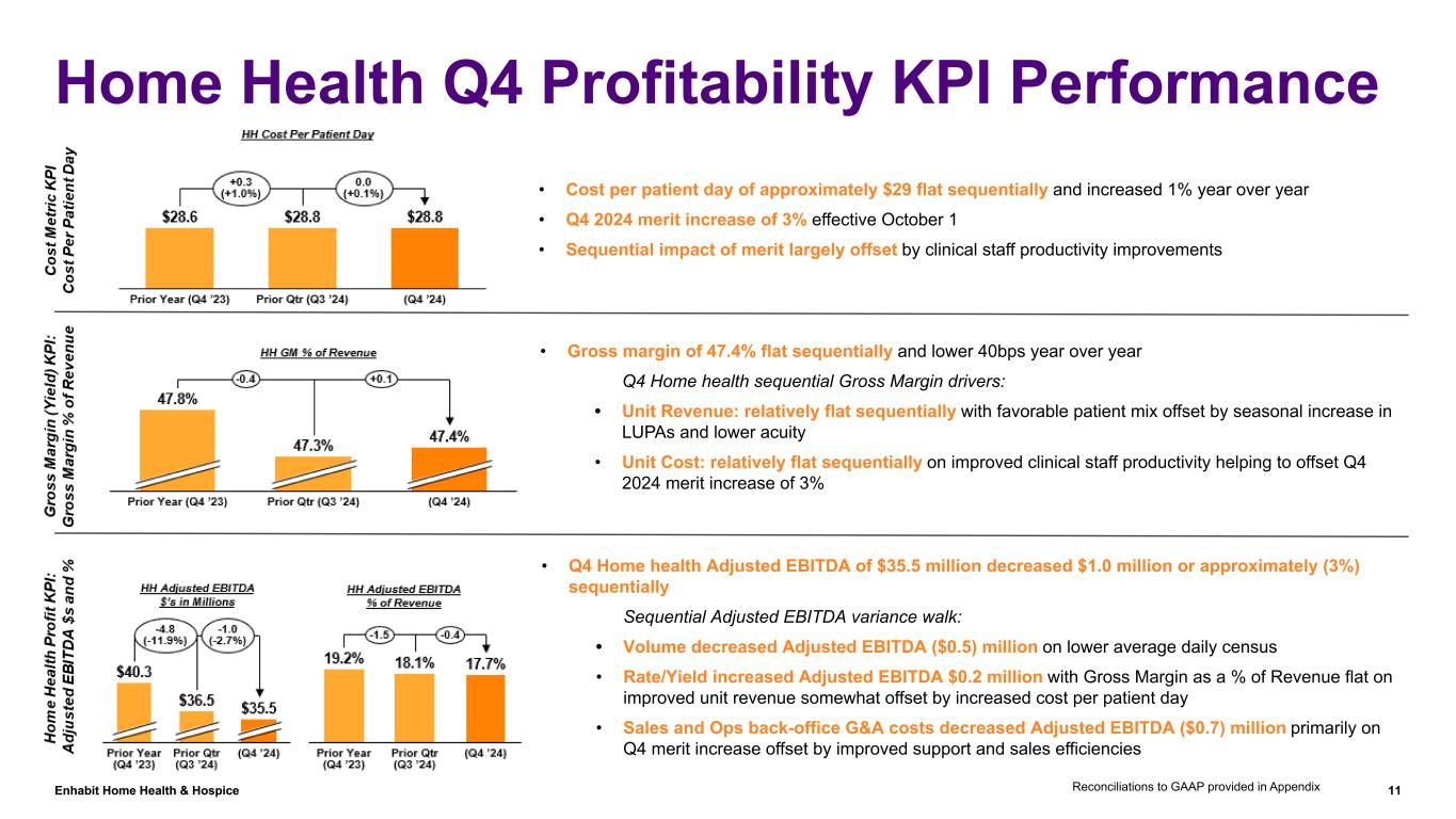 Enhabit Home Health & Hospice 10 Home Health Q4 Revenue KPI Performance • Payer Innovation strategy has set the stage for both Medicare and other episodic ADC growth which typically have a unit revenue advantage per patient day • Q4 2024 Medicare ADC growth sequentially of 1%, with continued focus to stabilize and grow in 2025 • Revenue per patient day of approximately $55 relatively flat, with favorable payer mix shift partially offset by increase in lower patient acuity mix • Home health total revenue decreased approximately $1 million or (0.3%) sequentially, while decreasing approximately $9 million or (4.3%) year over year Q4 Home health sequential revenue drivers: • Volume: decrease in average daily census of (0.5%) sequentially, primarily on lower admission volumes • Unit Revenue: increase in revenue per patient day of 0.1% sequentially reflects favorable payer mix shift somewhat offset by lower patient acuity mix • Total ADC sequential decline primarily due to impact of hurricanes. Year over year decline due to hurricanes and national contract negotiations • Key national contract signed in December 2024, while replacement efforts limited growth in Q4 2024 the new contract sets the stage for growth into 2025 on ability to remain a "full-service" provider to referral sources • Replacement efforts limited growth, but improved mix of patients with 74% of admissions in traditional Medicare and Payer Innovation contracts