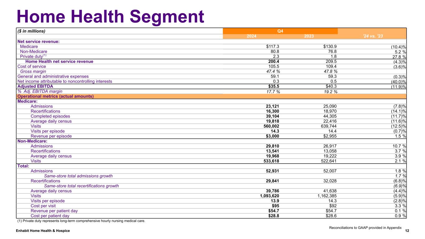 Enhabit Home Health & Hospice 12 Home Health Segment ($ in millions) Q4 '24 vs. '232024 2023 Net service revenue: Medicare $117.3 $130.9 (10.4) % Non-Medicare 80.8 76.8 5.2 % Private duty(1) 2.3 1.8 27.8 % Home Health net service revenue 200.4 209.5 (4.3) % Cost of service 105.5 109.4 (3.6) % Gross margin 47.4 % 47.8 % General and administrative expenses 59.1 59.3 (0.3) % Net income attributable to noncontrolling interests 0.3 0.5 (40.0) % Adjusted EBITDA $35.5 $40.3 (11.9) % % Adj. EBITDA margin 17.7 % 19.2 % Operational metrics (actual amounts) Medicare: Admissions 23,121 25,090 (7.8) % Recertifications 16,300 18,970 (14.1) % Completed episodes 39,104 44,305 (11.7) % Average daily census 19,818 22,416 (11.6) % Visits 560,002 639,744 (12.5) % Visits per episode 14.3 14.4 (0.7) % Revenue per episode $3,000 $2,955 1.5 % Non-Medicare: Admissions 29,810 26,917 10.7 % Recertifications 13,541 13,058 3.7 % Average daily census 19,968 19,222 3.9 % Visits 533,618 522,641 2.1 % Total: Admissions 52,931 52,007 1.8 % Same-store total admissions growth 1.7 % Recertifications 29,841 32,028 (6.8) % Same-store total recertifications growth (6.9) % Average daily census 39,786 41,638 (4.4) % Visits 1,093,620 1,162,385 (5.9) % Visits per episode 13.9 14.3 (2.8) % Cost per visit $95 $92 3.3 % Revenue per patient day $54.7 $54.7 0.1 % Cost per patient day $28.8 $28.6 0.9 % (1) Private duty represents long-term comprehensive hourly nursing medical care. Reconciliations to GAAP provided in Appendix