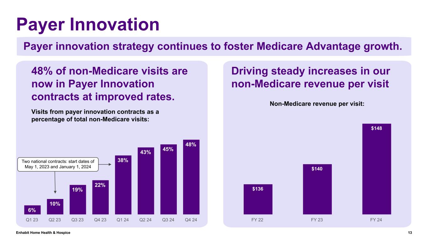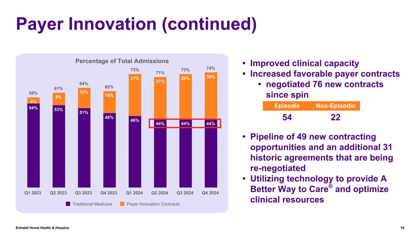 Enhabit Home Health & Hospice 13 Payer Innovation Payer innovation strategy continues to foster Medicare Advantage growth. Driving steady increases in our non-Medicare revenue per visit 48% of non-Medicare visits are now in Payer Innovation contracts at improved rates. Visits from payer innovation contracts as a percentage of total non-Medicare visits: Non-Medicare revenue per visit: $136 $140 $148 FY 22 FY 23 FY 24 6% 10% 19% 22% 38% 43% 45% 48% Q1 23 Q2 23 Q3 23 Q4 23 Q1 24 Q2 24 Q3 24 Q4 24 Two national contracts: start dates of May 1, 2023 and January 1, 2024