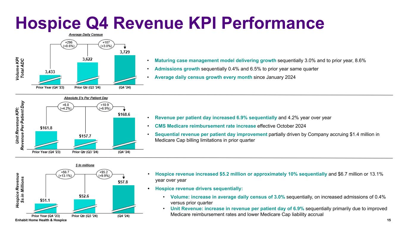 Enhabit Home Health & Hospice 14 Payer Innovation (continued) • Improved clinical capacity • Increased favorable payer contracts • negotiated 76 new contracts since spin • Pipeline of 49 new contracting opportunities and an additional 31 historic agreements that are being re-negotiated • Utilizing technology to provide A Better Way to Care® and optimize clinical resources Percentage of Total Admissions 54% 53% 51% 48% 46% 44% 44% 44% 4% 8% 13% 14% 27% 27% 29% 30% 58% 61% 64% 62% 73% 71% 73% 74% Traditional Medicare Payer Innovation Contracts Q1 2023 Q2 2023 Q3 2023 Q4 2023 Q1 2024 Q2 2024 Q3 2024 Q4 2024 Episodic Non-Episodic 54 22