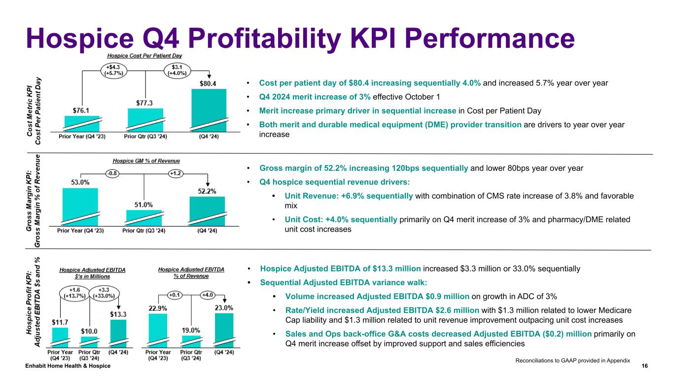 Enhabit Home Health & Hospice 15 Hospice Q4 Revenue KPI Performance • Revenue per patient day increased 6.9% sequentially and 4.2% year over year • CMS Medicare reimbursement rate increase effective October 2024 • Sequential revenue per patient day improvement partially driven by Company accruing $1.4 million in Medicare Cap billing limitations in prior quarter • Maturing case management model delivering growth sequentially 3.0% and to prior year, 8.6% • Admissions growth sequentially 0.4% and 6.5% to prior year same quarter • Average daily census growth every month since January 2024 • Hospice revenue increased $5.2 million or approximately 10% sequentially and $6.7 million or 13.1% year over year • Hospice revenue drivers sequentially: • Volume: increase in average daily census of 3.0% sequentially, on increased admissions of 0.4% versus prior quarter • Unit Revenue: increase in revenue per patient day of 6.9% sequentially primarily due to improved Medicare reimbursement rates and lower Medicare Cap liability accrual