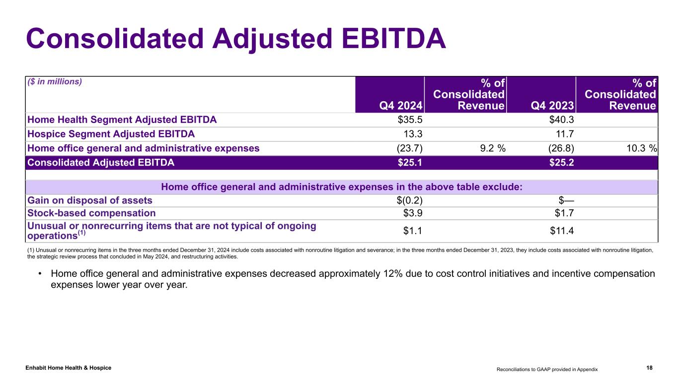 Enhabit Home Health & Hospice 17 Hospice Segment ($ in millions) Q4 '24 vs. '232024 2023 Net service revenue $57.8 $51.1 13.1 % Cost of service 27.6 24.0 15.0 % Gross margin 52.2 % 53.0 % General and administrative expenses 17.0 15.4 10.4 % Net income attributable to noncontrolling interests (0.1) — — % Adjusted EBITDA $13.3 $11.7 13.7 % % Adj. EBITDA margin 23.0 % 22.9 % Operational metrics (actual amounts) Total admissions 3,059 2,872 6.5 % Same-store total admissions growth 4.4 % Patient days 343,063 315,870 8.6 % Discharged average length of stay 110 102 7.8 % Average daily census 3,729 3,433 8.6 % Revenue per patient day $168.6 $161.8 4.2 % Cost per patient day $80.4 $76.1 5.7 % Reconciliations to GAAP provided in Appendix